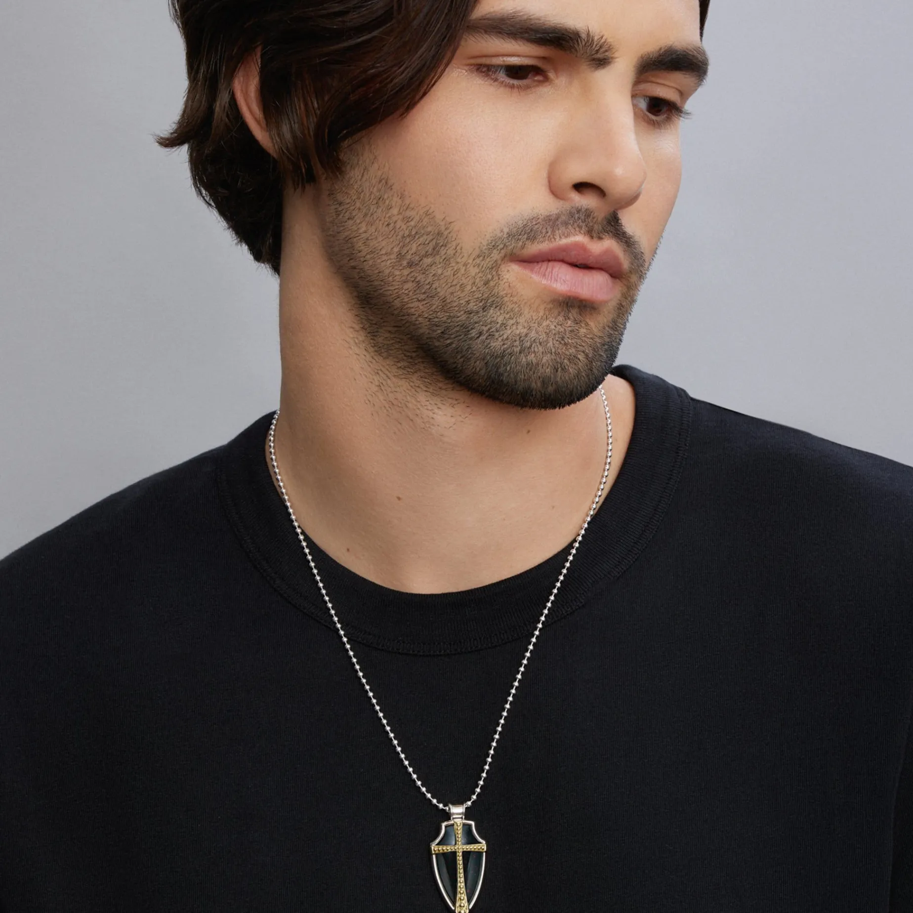 Bloodstone Gemstone Accented By Sterling Silver And 18K Gold Caviar Beading Form This Shield Amulet.