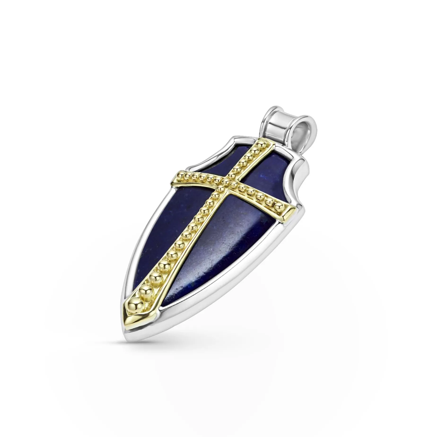 Lapis Gemstone Accented By Sterling Silver And 18K Gold Caviar Beading Form This Shield Amulet.