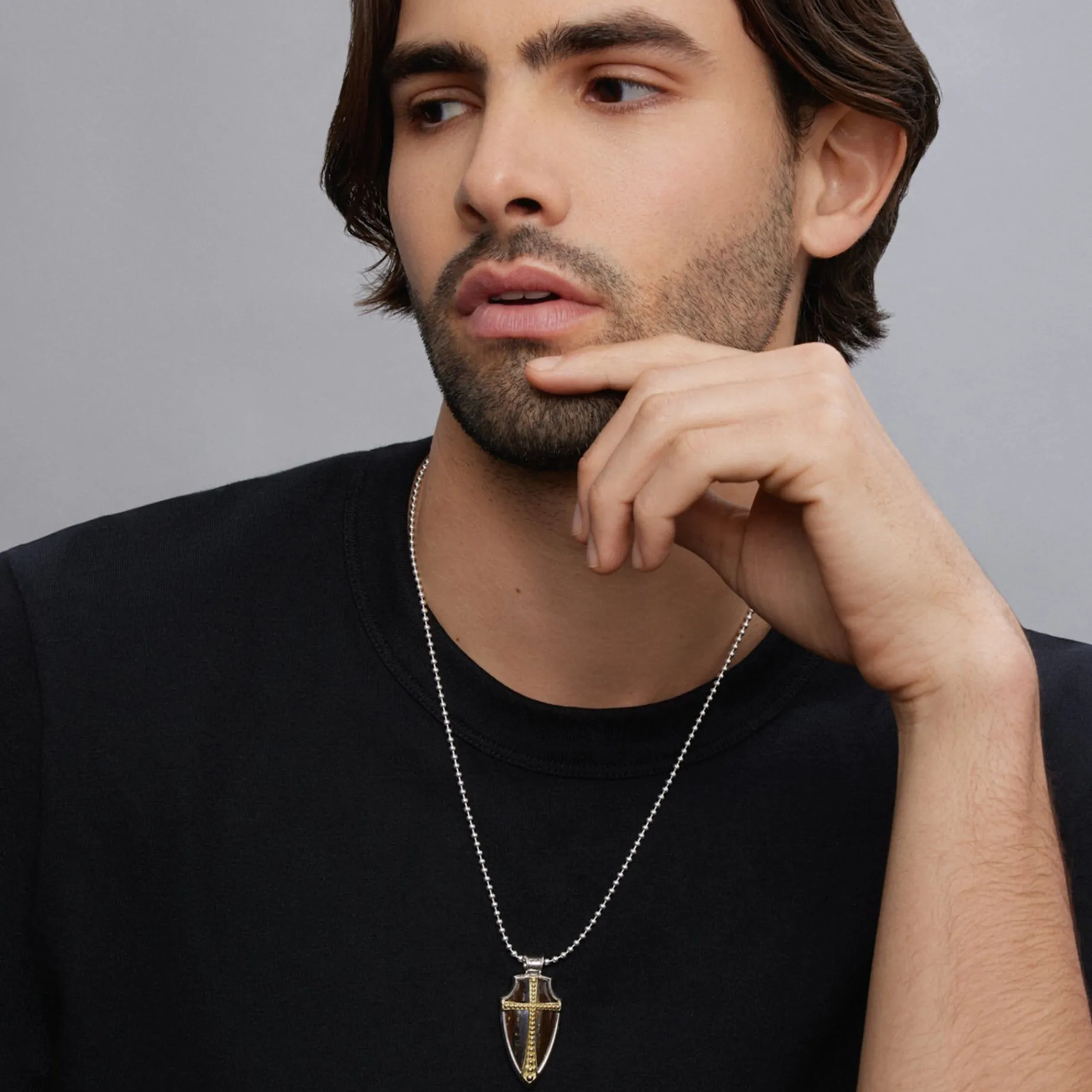 Tiger Iron Gemstone Accented By Sterling Silver And 18K Gold Caviar Beading Form This Shield Amulet.