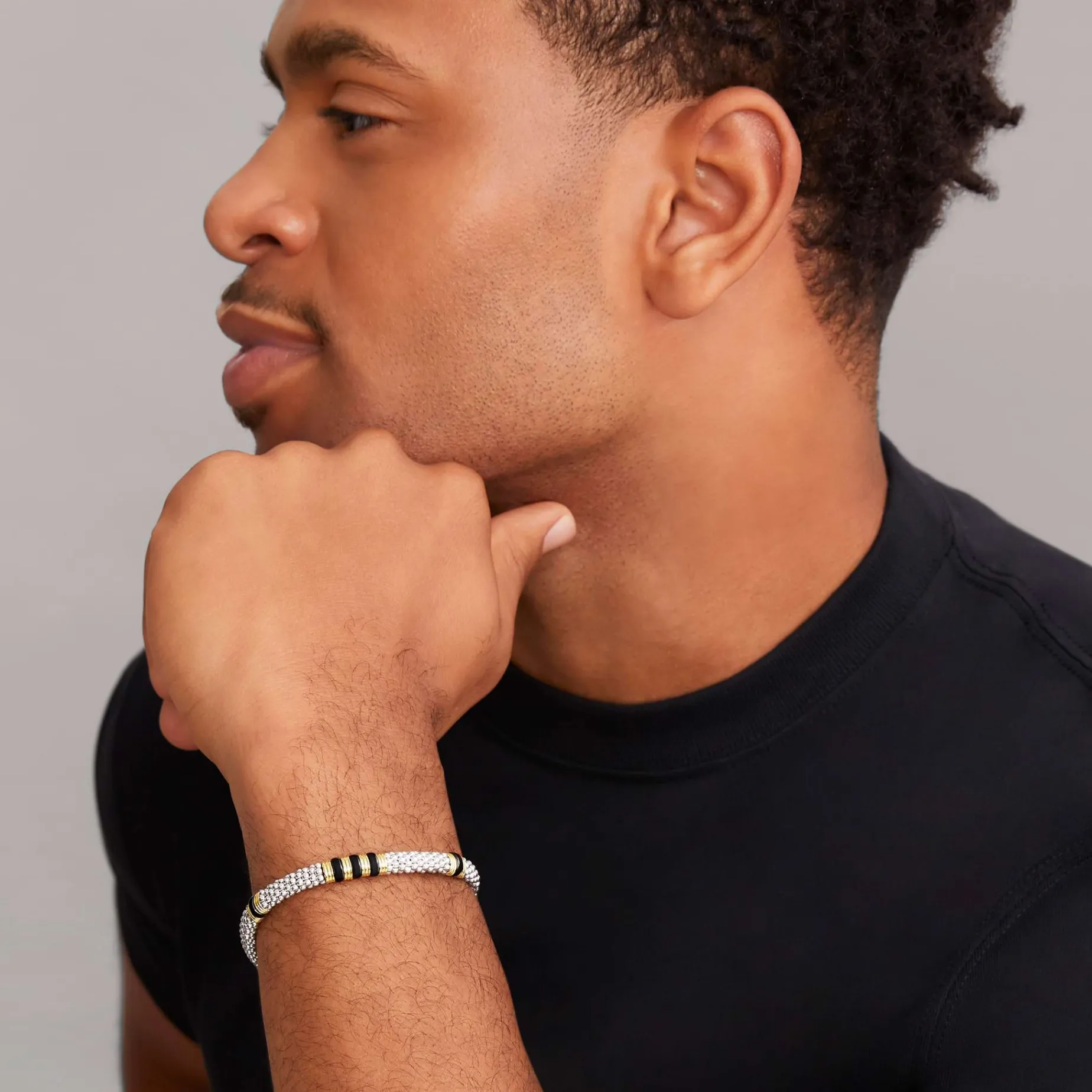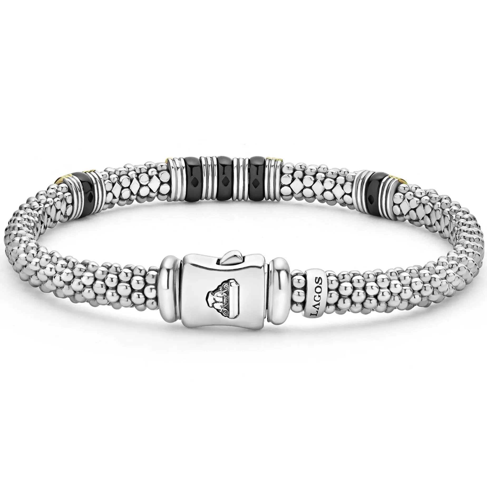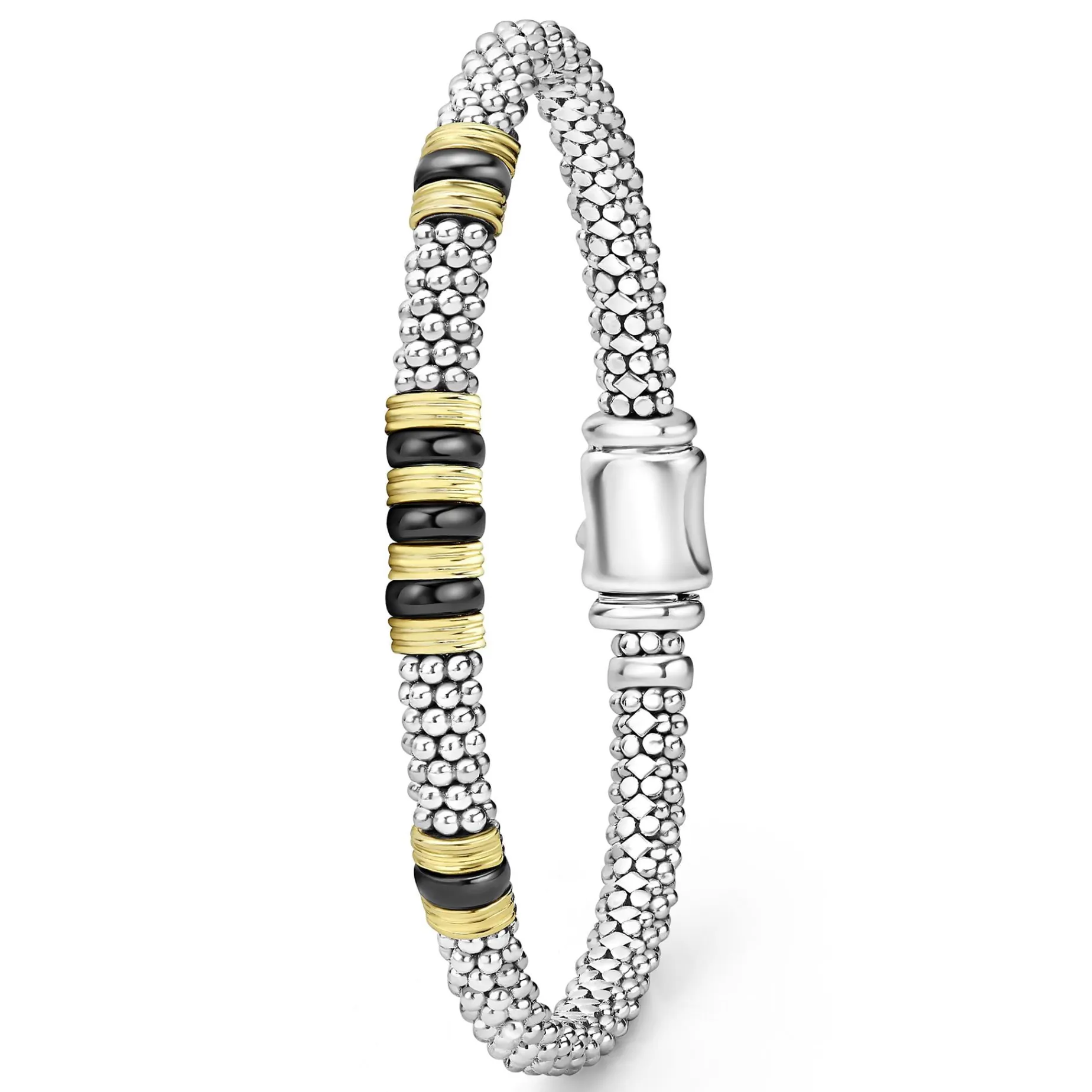 Three 18K Gold And Black Ceramic Stations Set In Sterling Silver Caviar Beading.