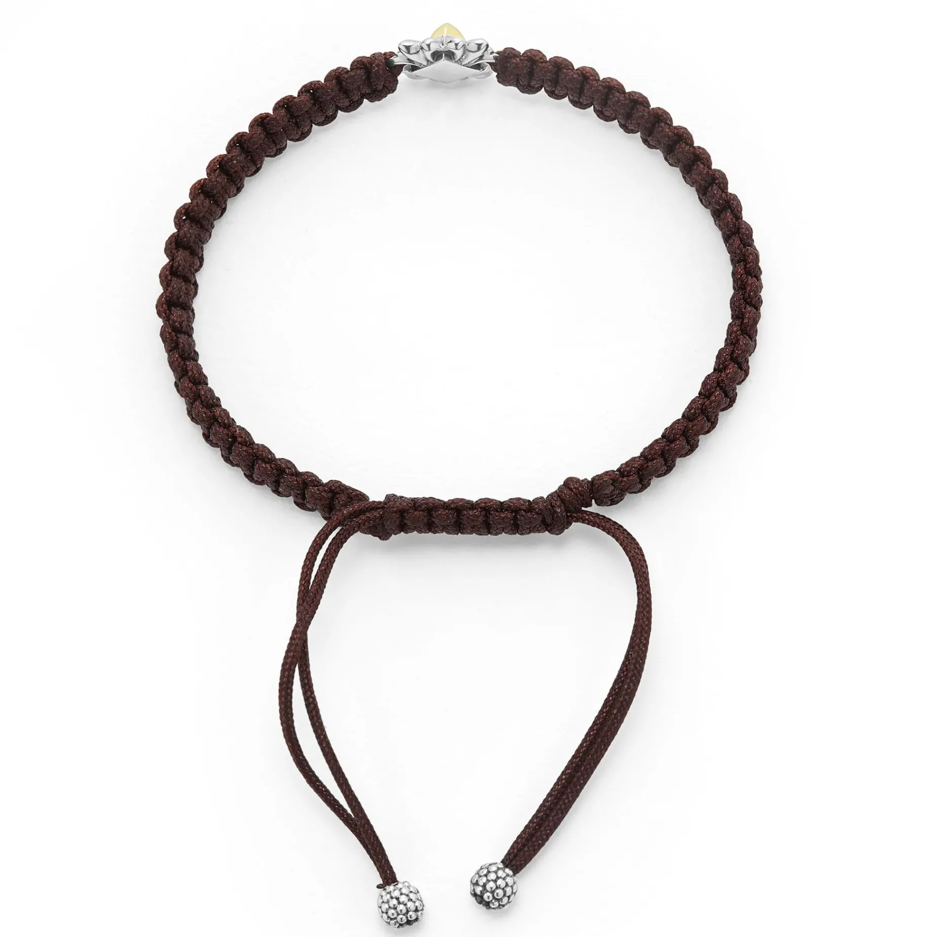 Brown Braided Nylon With A Sterling Silver And 18K Gold Medieval Motif Forms This Versatile Macrame Bracelet.