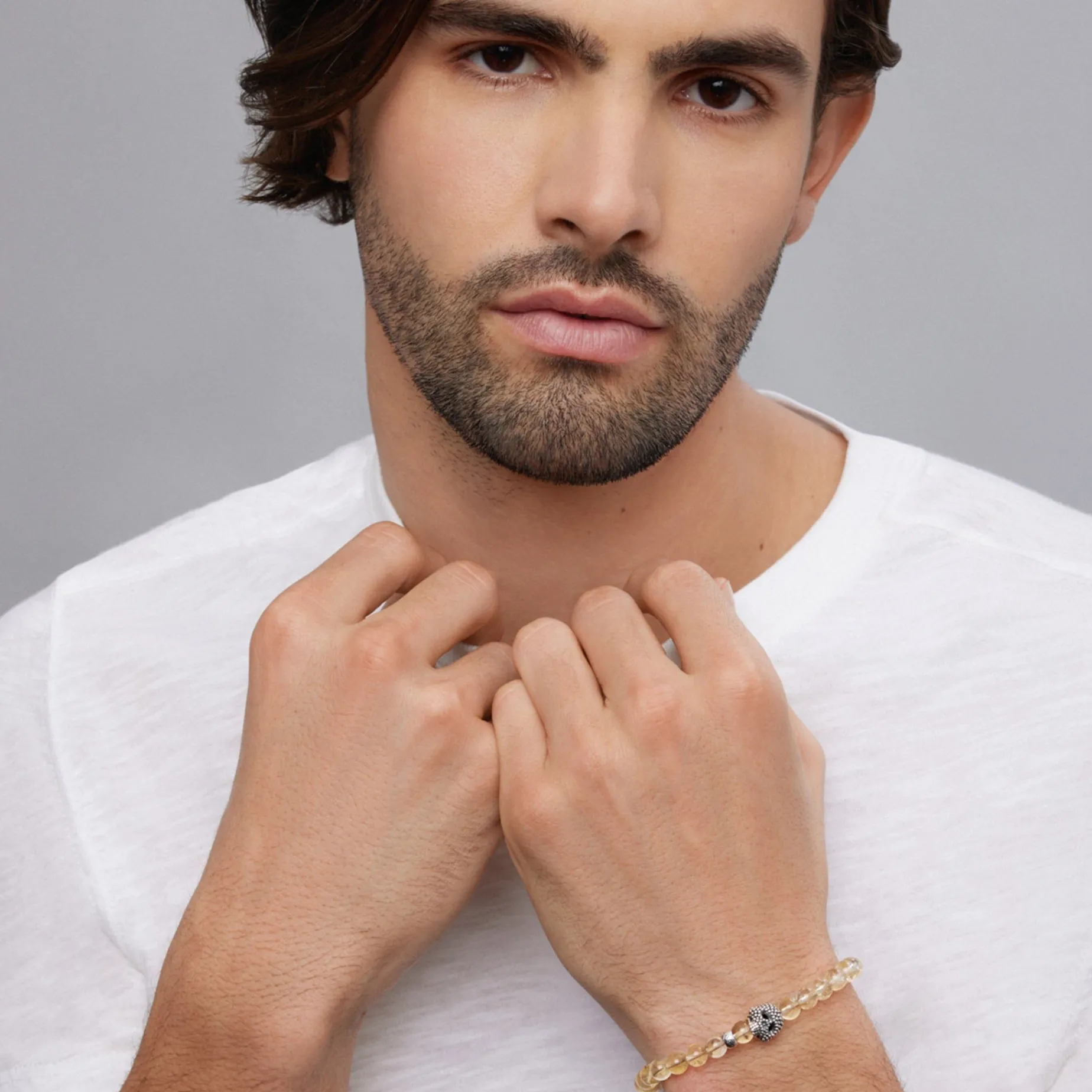 Citrine Gemstone Beaded Bracelet With A Sterling Silver Caviar Skull.