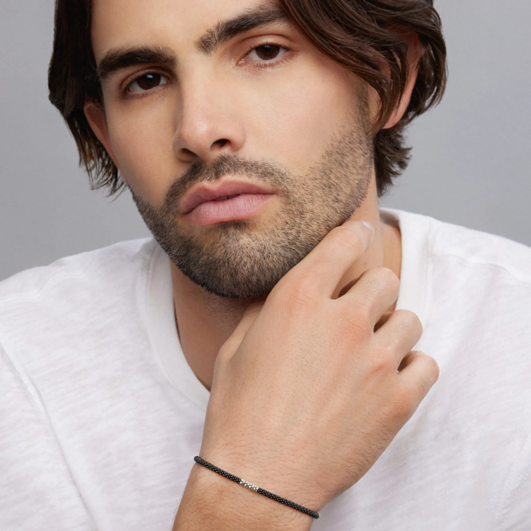 Matte Black Ceramic Caviar Bracelet Accented By Three Sterling Silver Stations.