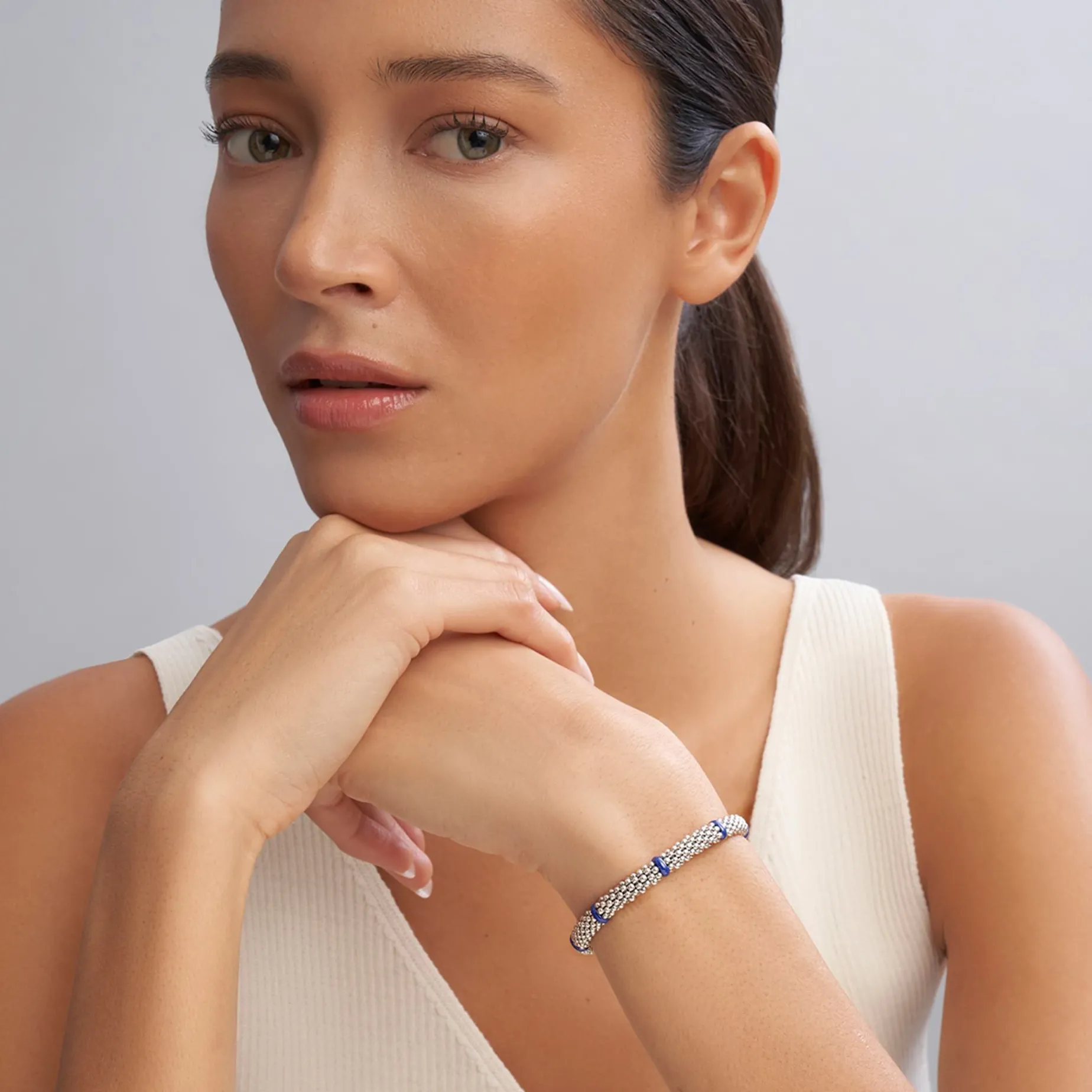 Seven Smooth Ultramarine Ceramic Stations Highlight Sterling Silver Caviar Beading On This Signature Bracelet.