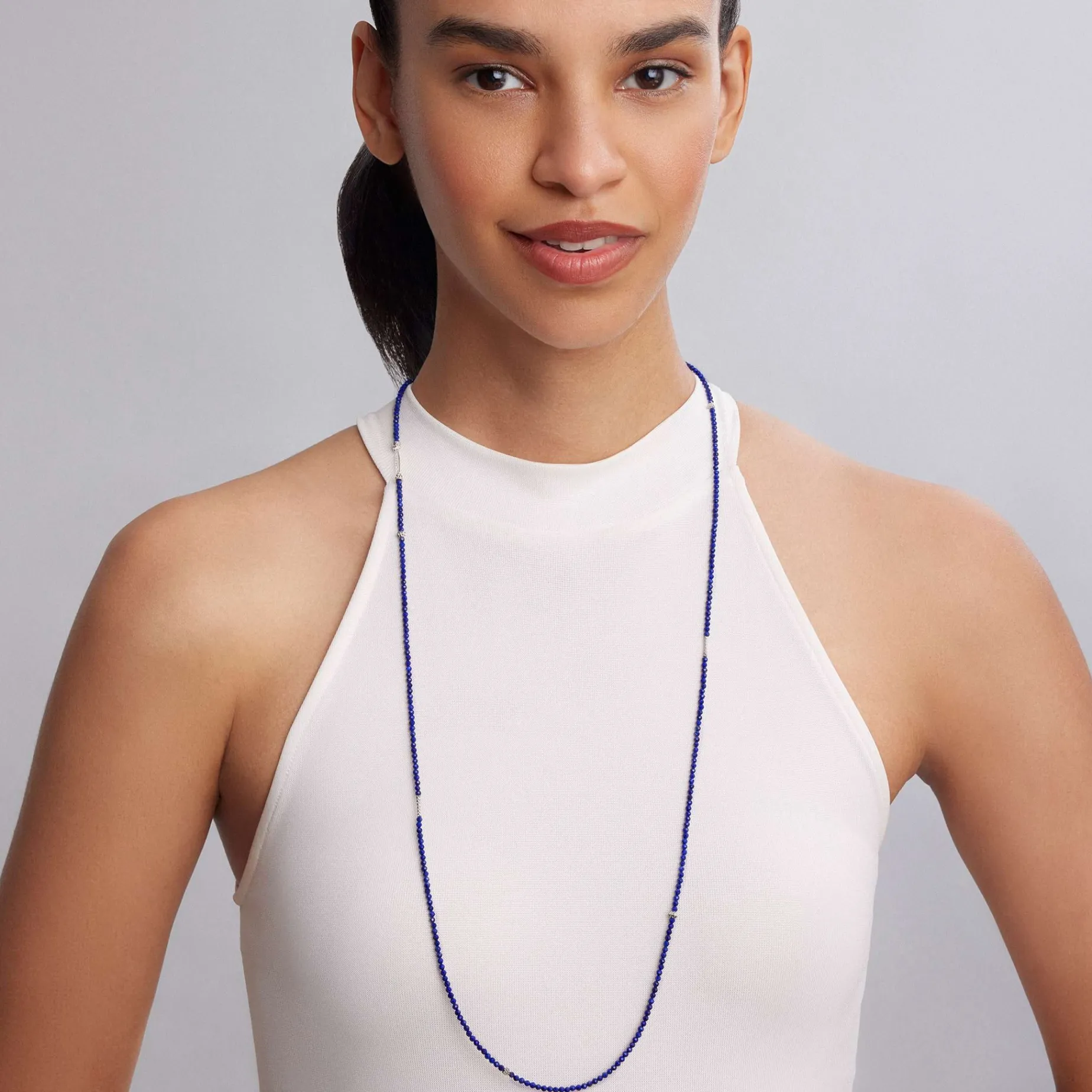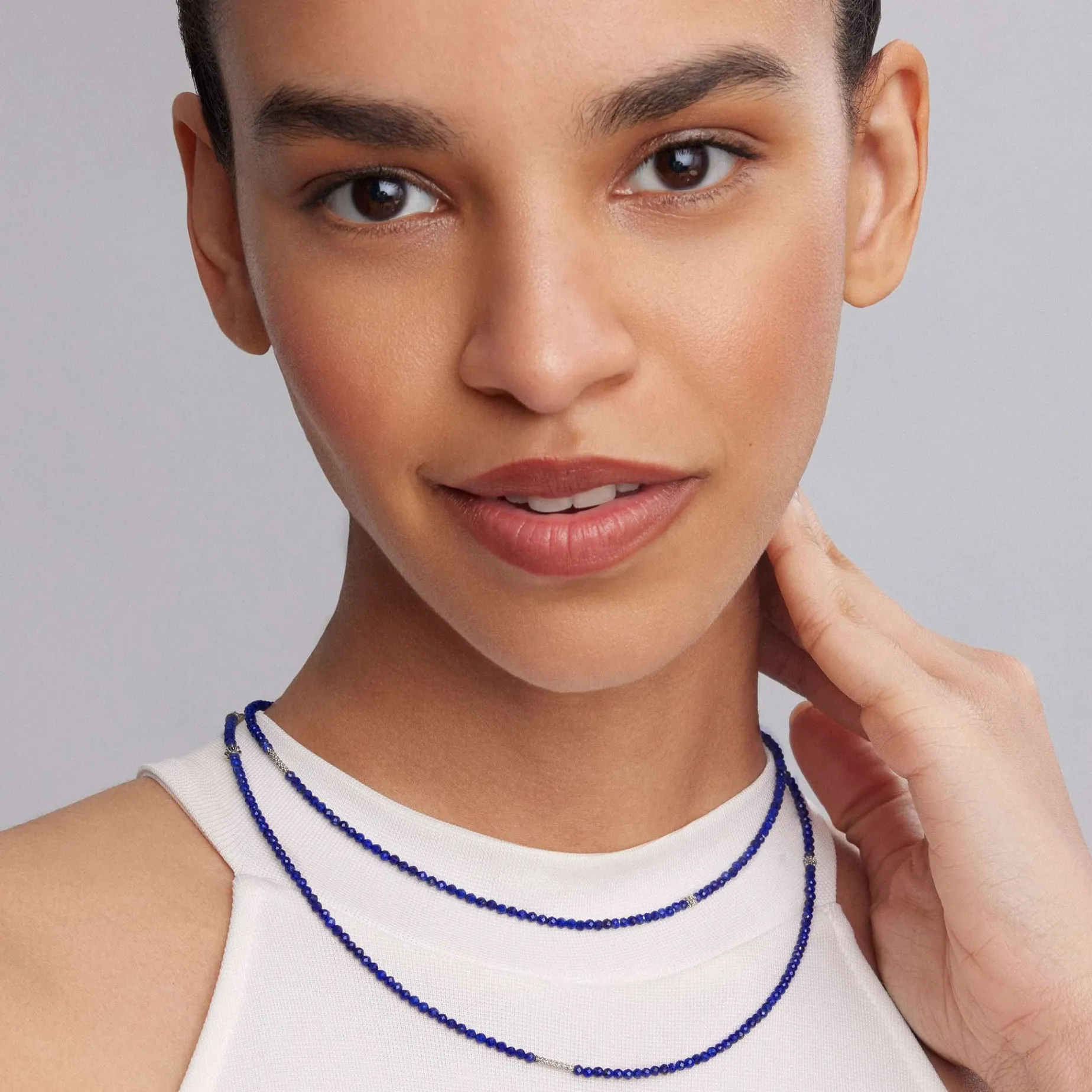Lapis Gemstone Beaded Necklace With Caviar Beading And Fluted Accents. Gemstones Are Natural With Unique Hues. Variations From The Colors Shown Make Each Necklace Unique.