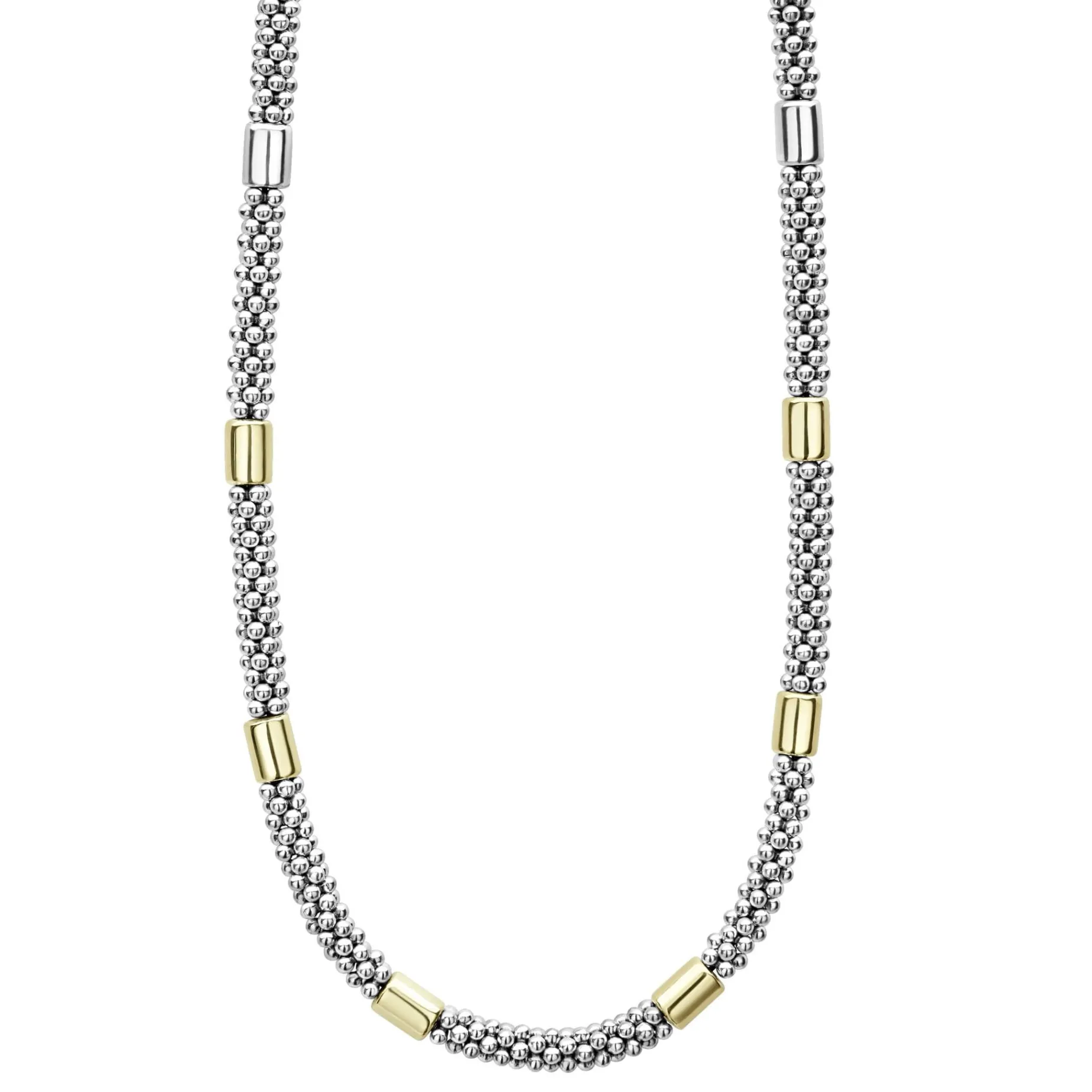 Ten Smooth Stations Of 18K Gold And Sterling Silver Surrounded By Caviar Beading.