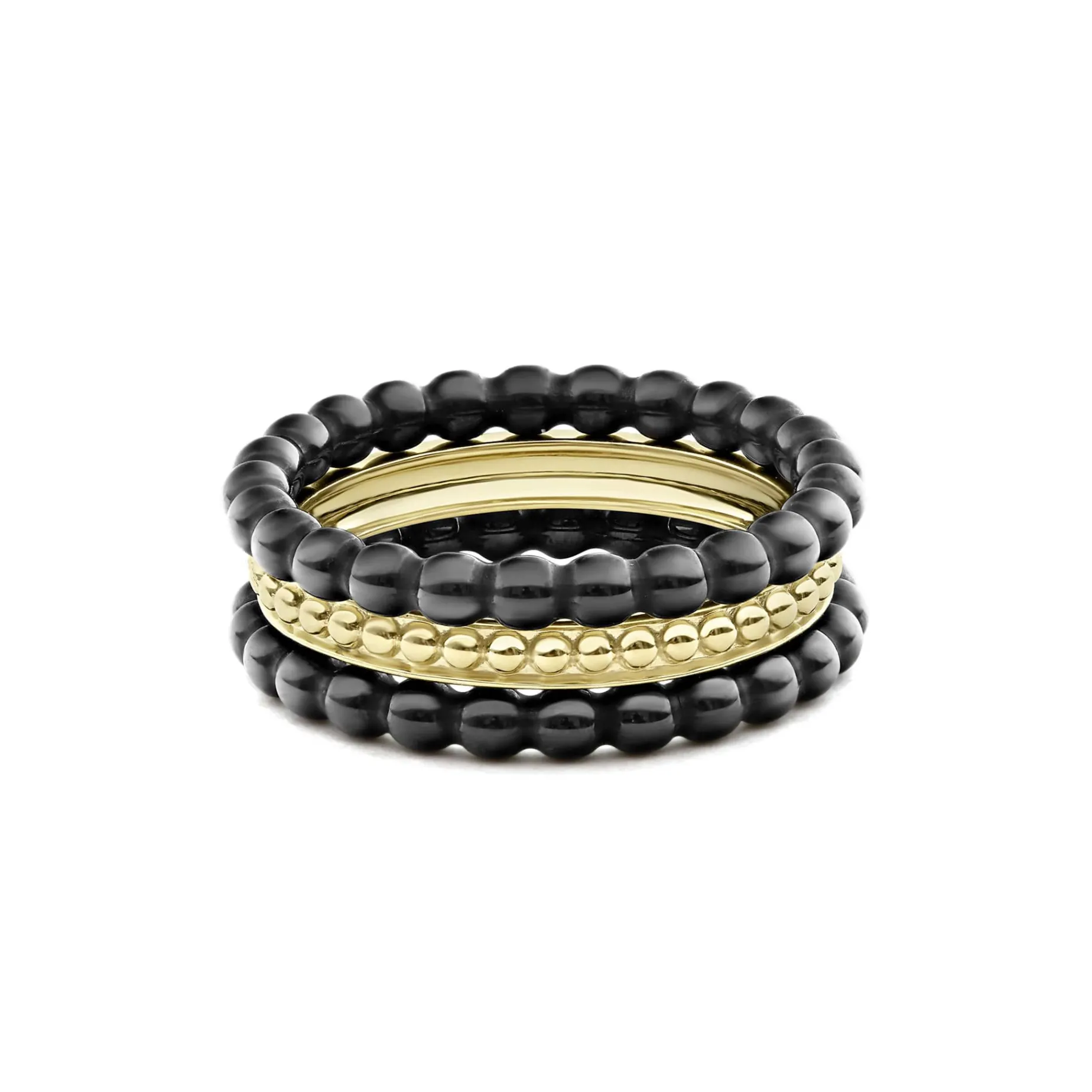 Three Stacking Rings Form This Set With Two Black Ceramic Beaded Rings And One 18K Gold Ring.