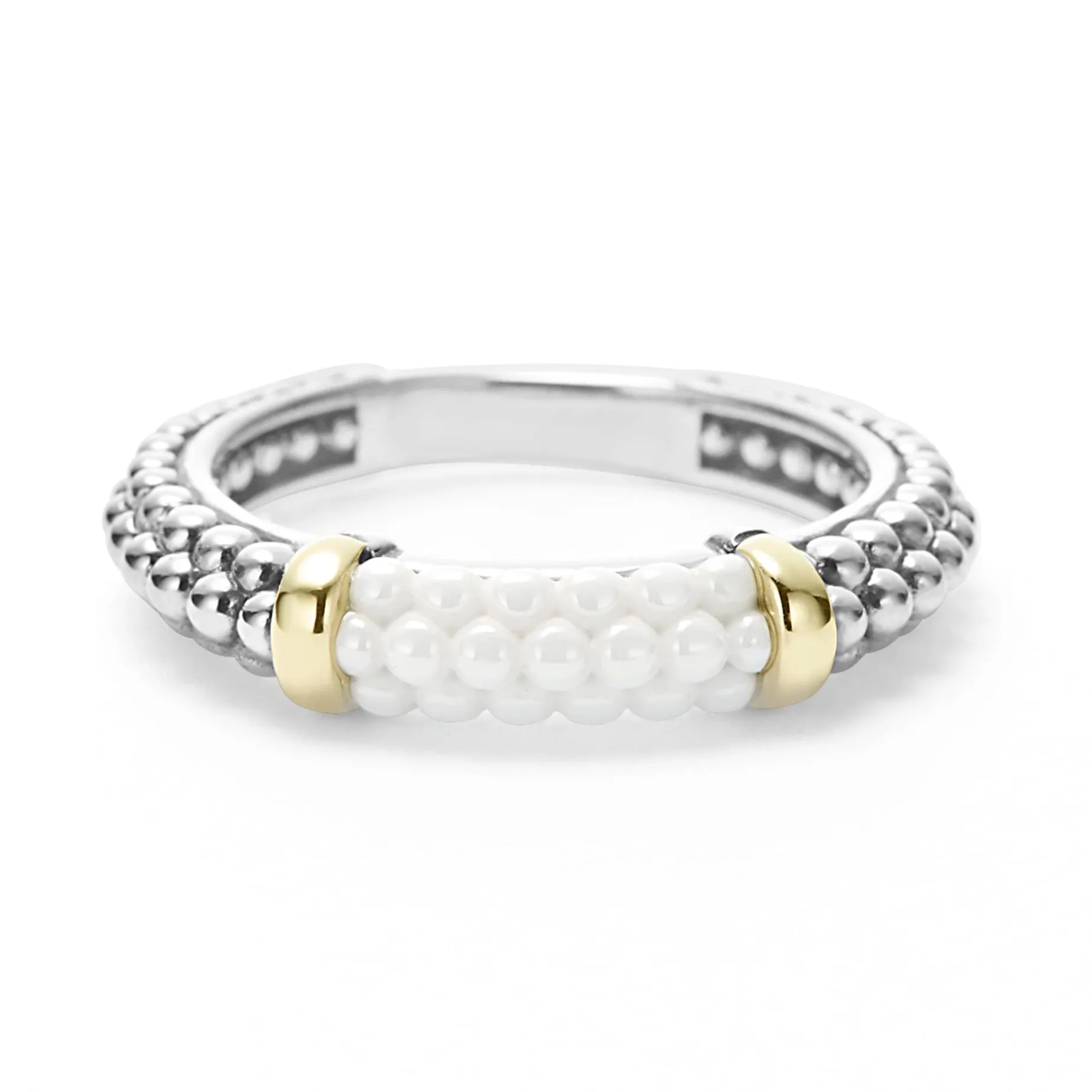 White Ceramic Stacking Ring With 18K Gold And Sterling Silver Caviar Beading.