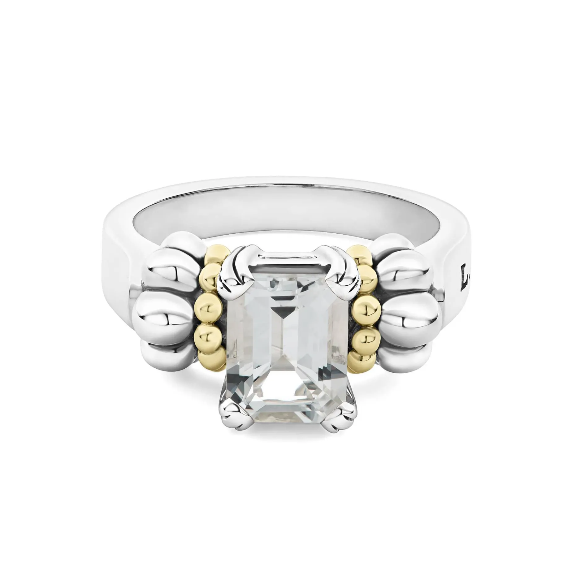 The Return Of A Lagos Icon. Our Signature Emerald-Cut White Topaz Gemstone Ring With A Prong Setting In Sterling Silver And 18K Gold Caviar Beading.