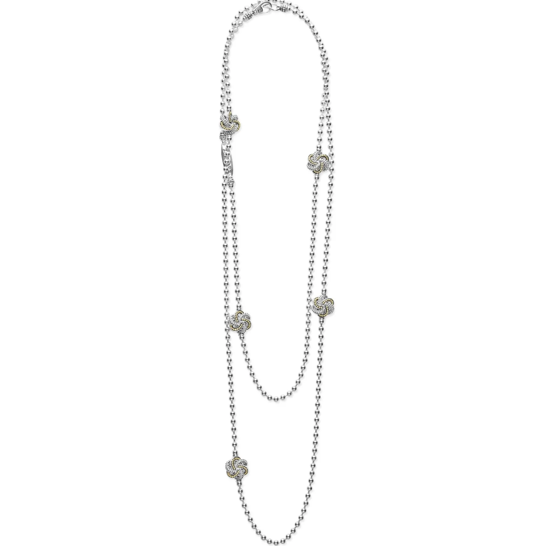 Five 18K Gold And Sterling Silver Love Knot Stations Accent This Caviar Necklace Strand.