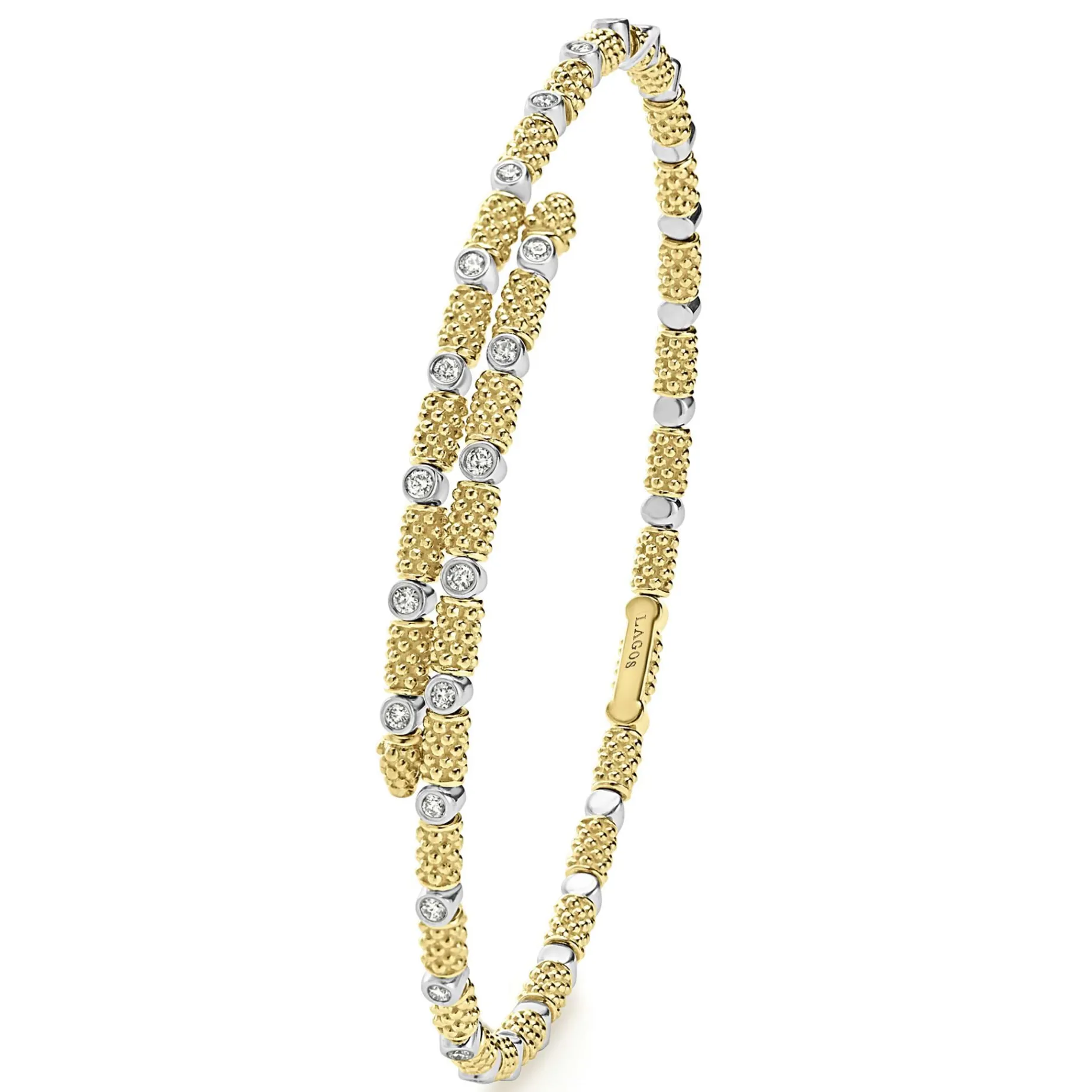 Diamonds Surrounded By 18K Gold Superfine Caviar Beading Form This Cuff Bracelet. Lagos Diamonds Are The Highest Quality Natural Stones.