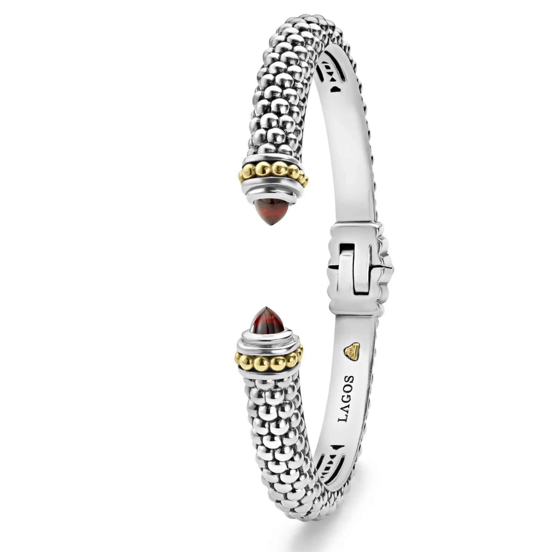 Caviar Beading And Highly Polished Sterling Silver Stations Comprise This Innovative Cuff Bracelet Detailing Garnet Gemstone End Caps.