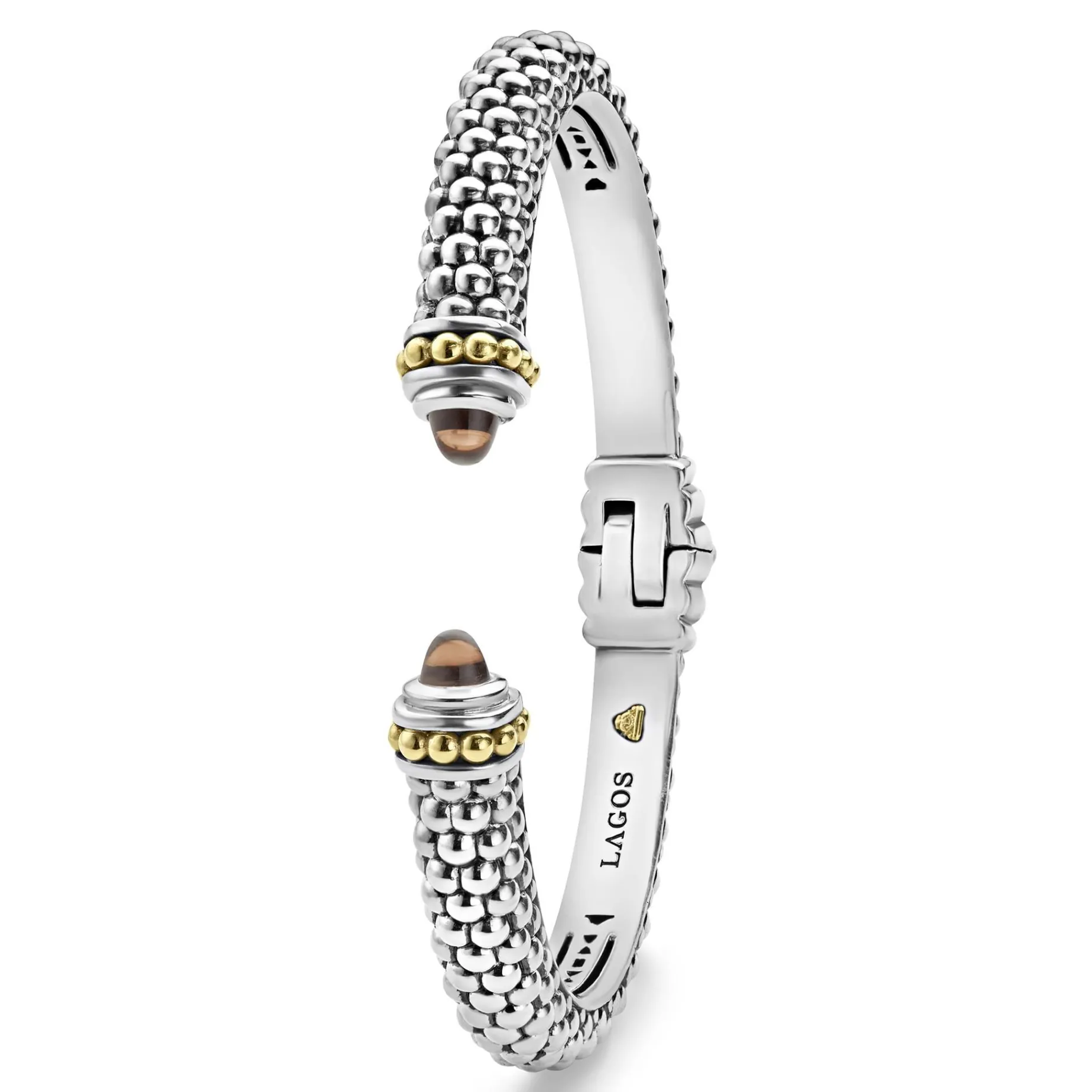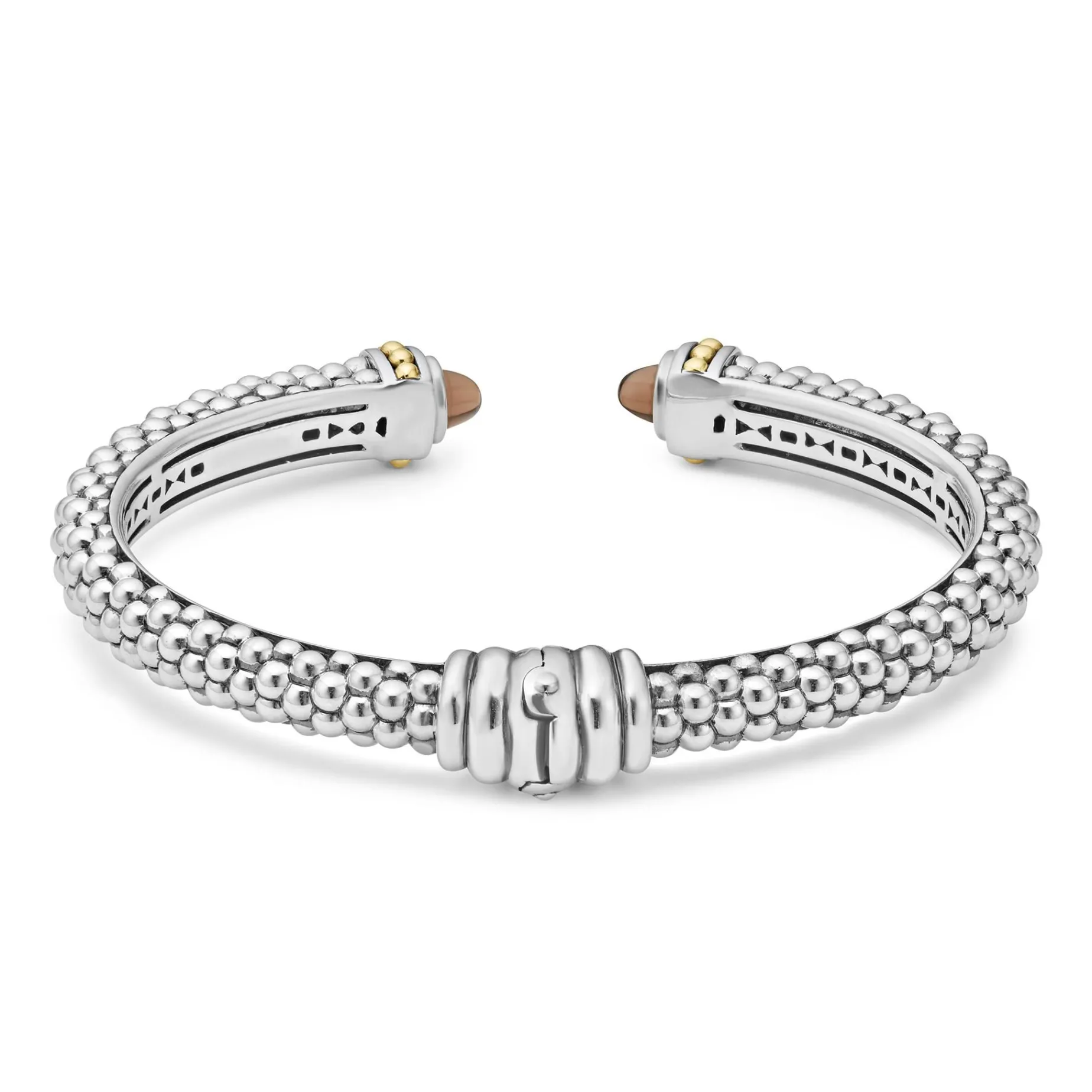 Caviar Beading With Highly Polished Sterling Silver Stations Comprise This Innovative Cuff Bracelet Detailing Faceted Smokey Quartz Gemstone End Caps. Finished With A Hinge Clasp.