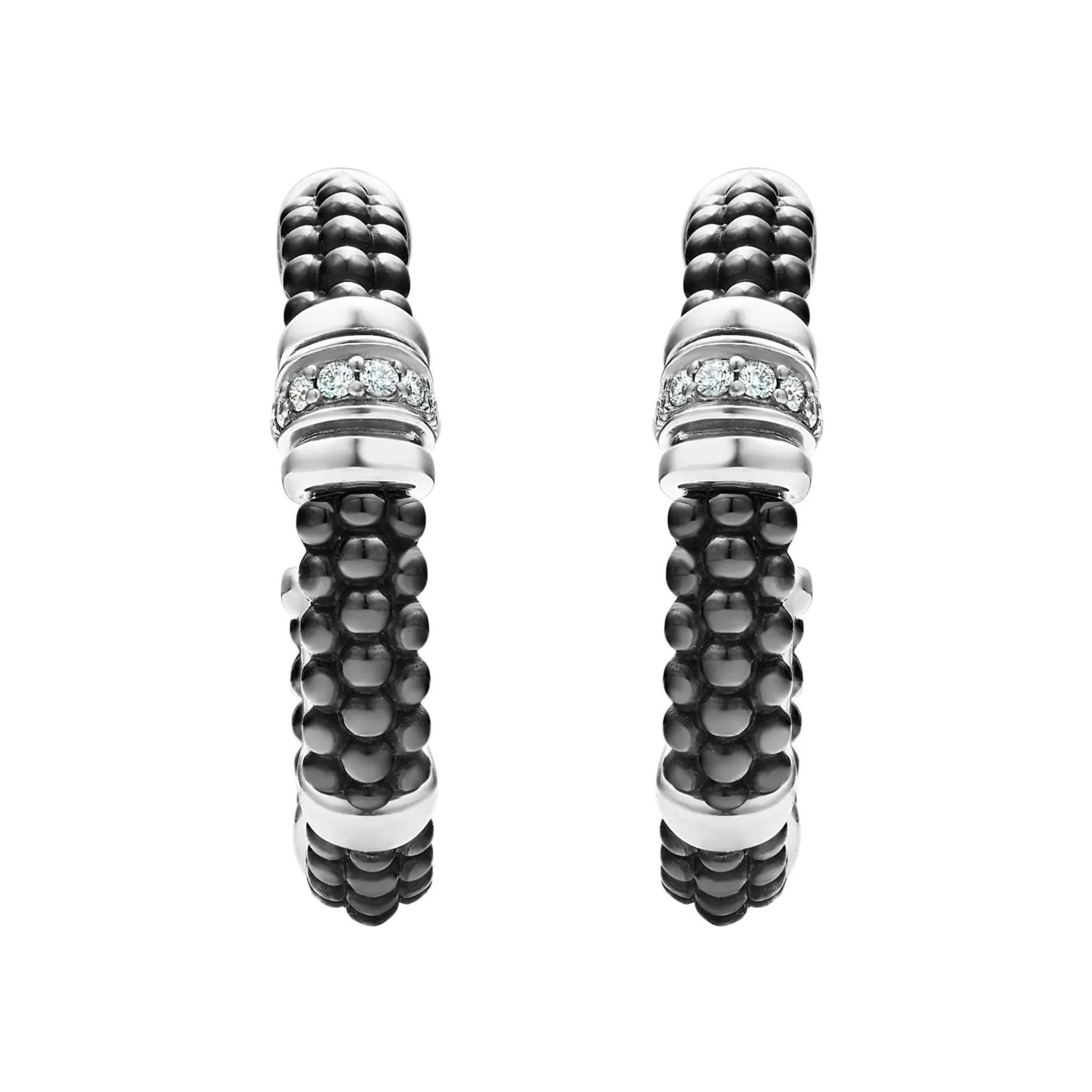 Black Ceramic Caviar Beading, Sterling Silver And Diamonds Form These Hoop Earrings. Lagos Diamonds Are The Highest Quality Natural Stones.