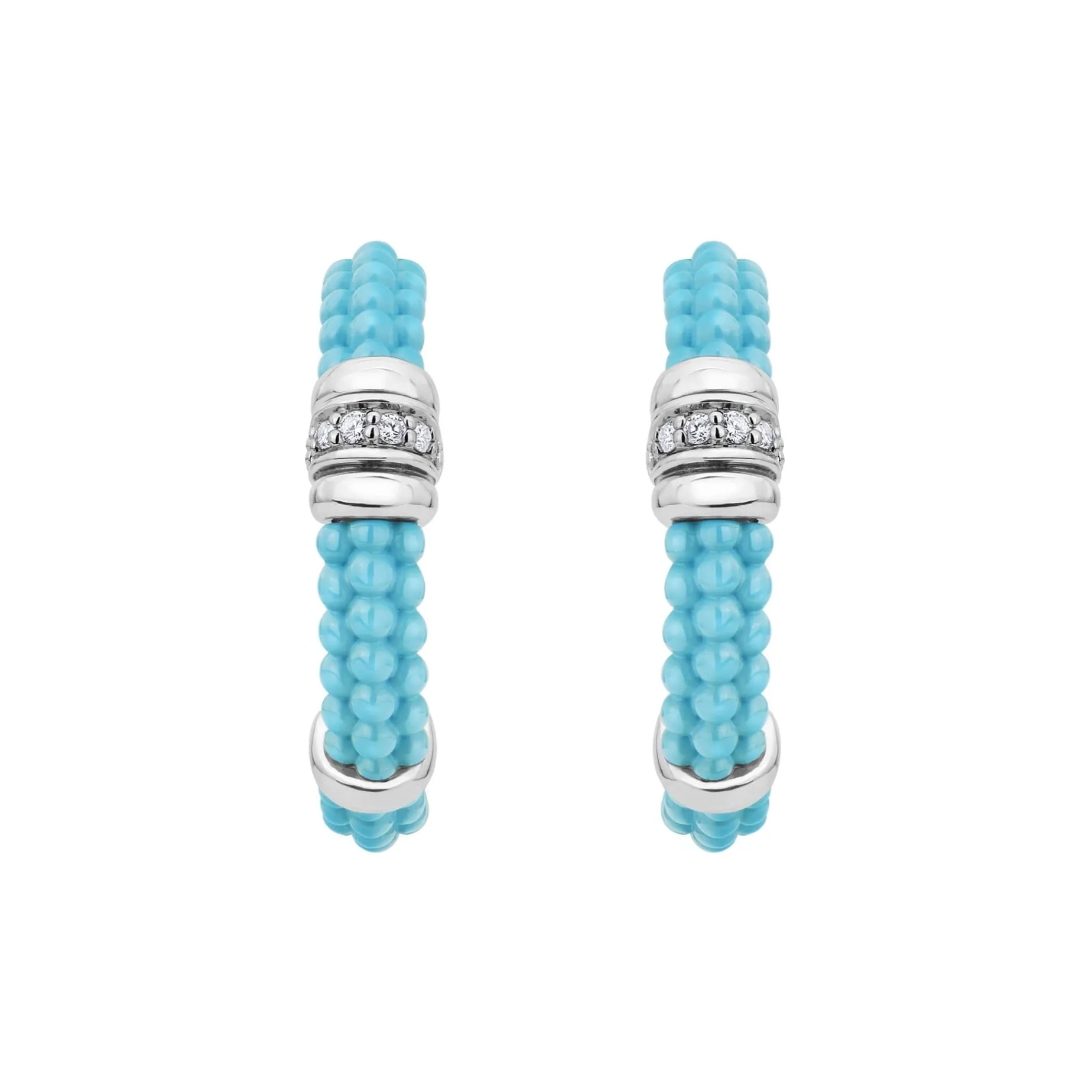 Blue Ceramic Caviar Beading, Sterling Silver And Diamonds Form These Hoop Earrings. Lagos Diamonds Are The Highest Quality Natural Stones.