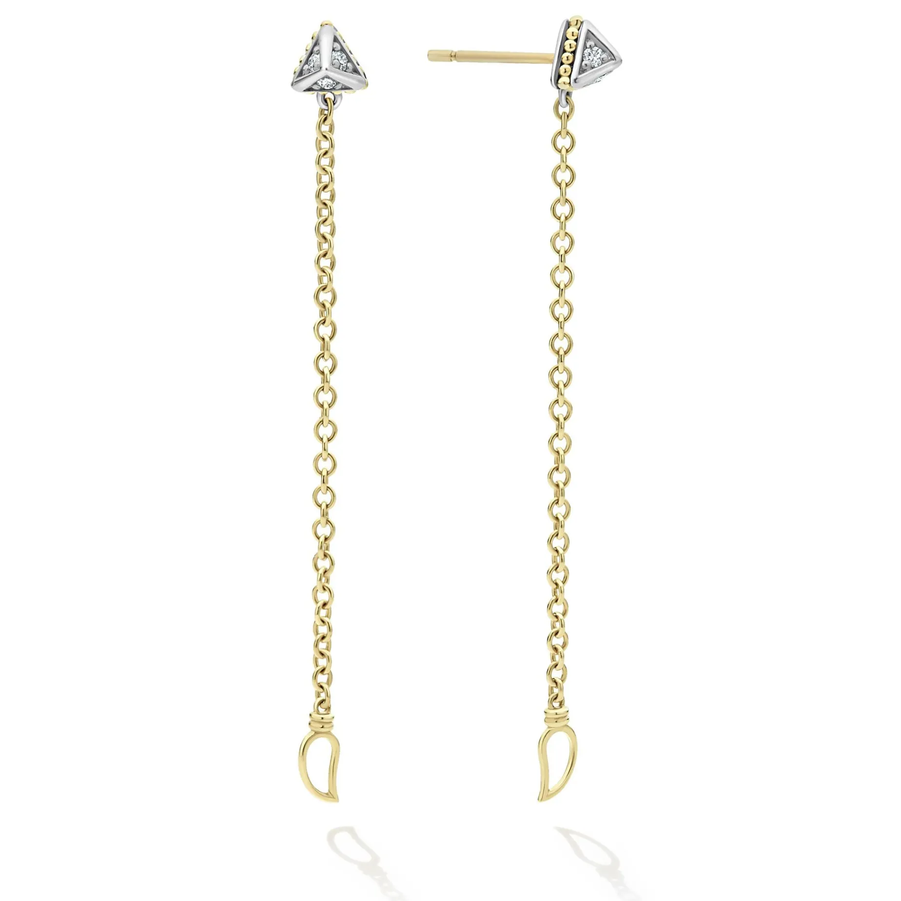 The Convertible Chain Earrings Featuring A Diamond Pyramid With An 18K Gold Chain That Offers Three Different Ways To Wear: Drop, Hook Chain On Same Ear Piercing, And Hook Chain On Different Ear Piercing.