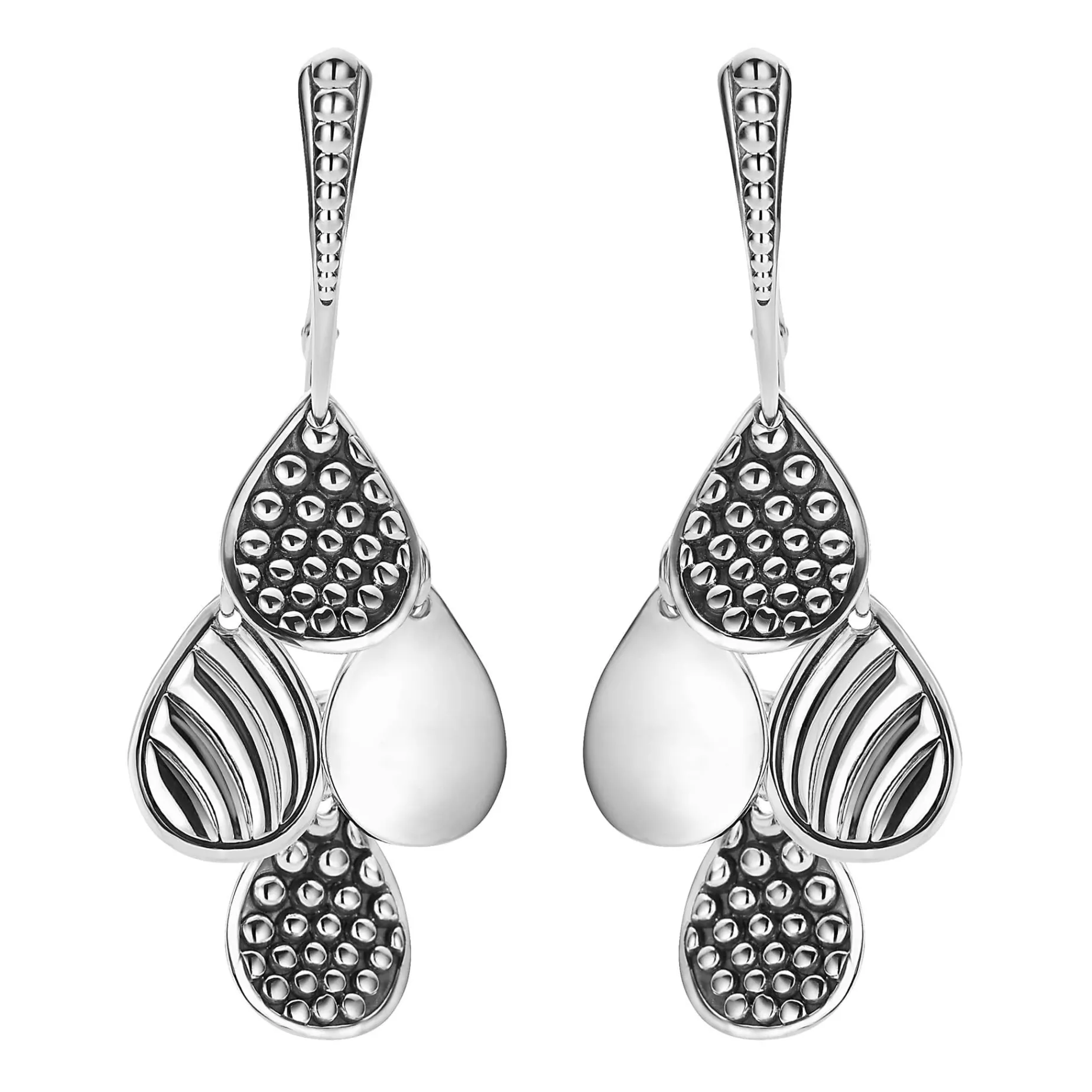 Teardrop Shapes Of Smooth Sterling Silver, Caviar Beading, And Fluted Sterling Silver On These Lightweight Drop Earrings.