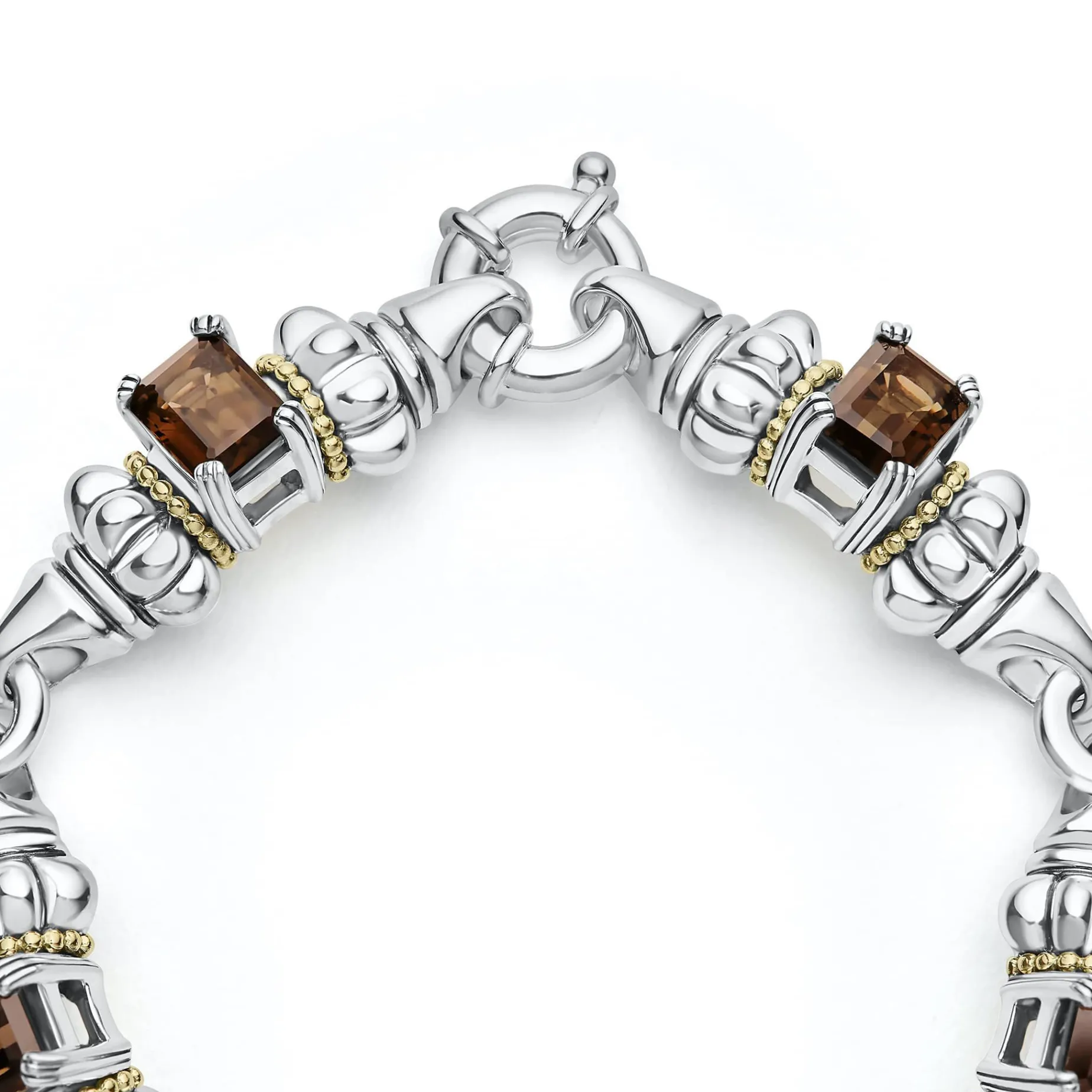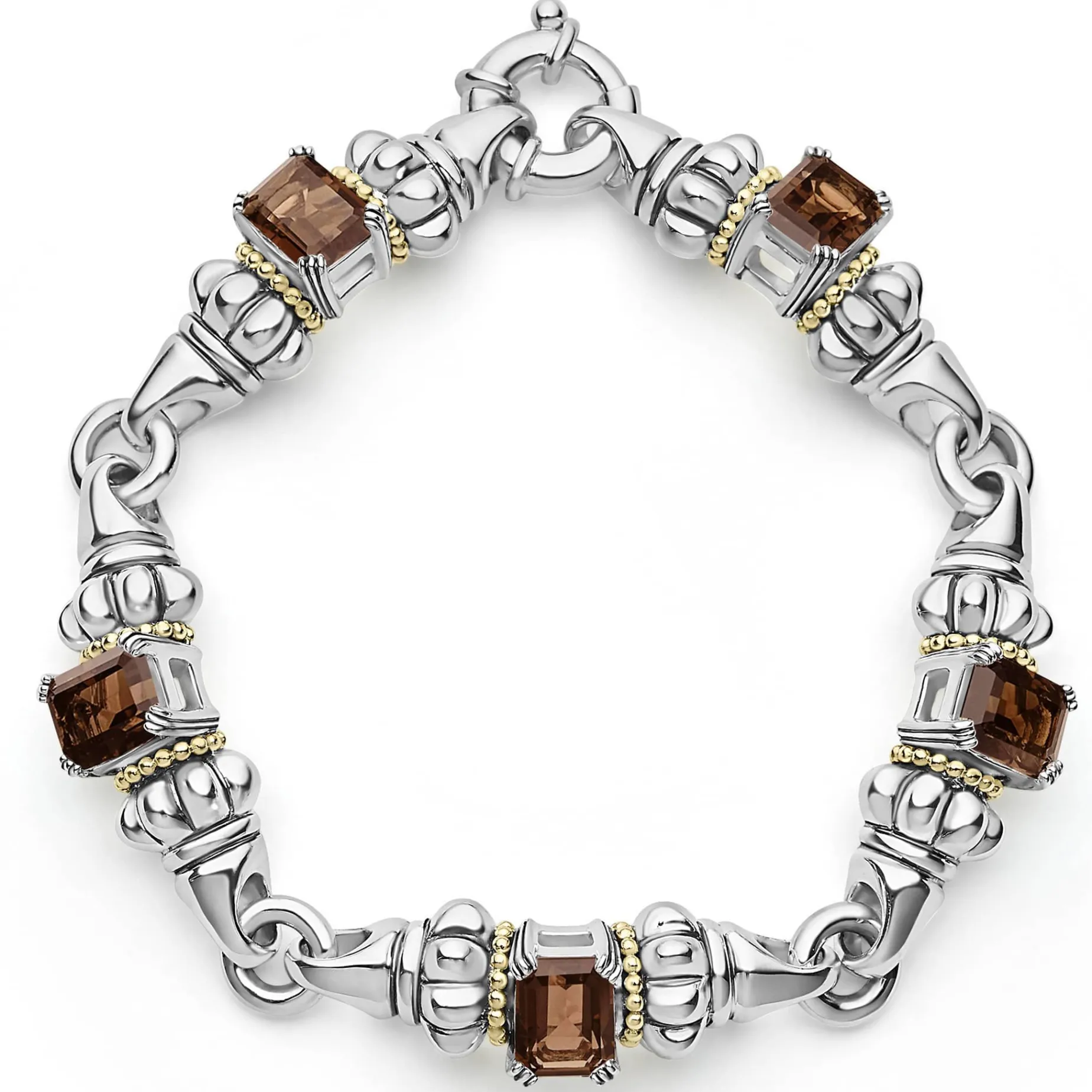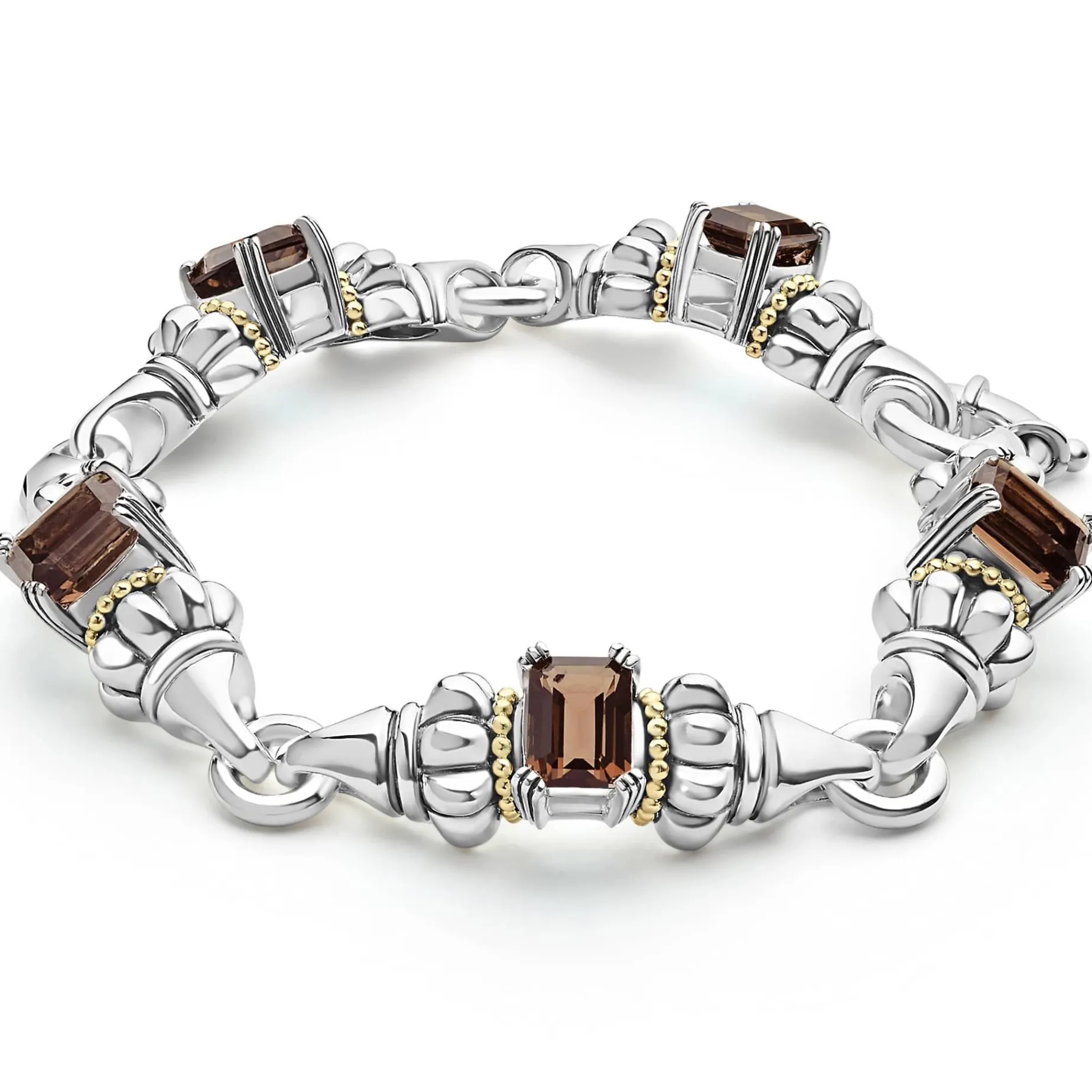 Five Smokey Quartz Emerald-Cut Gemstones, With 18K Gold And Sterling Silver Detailing Form This Bracelet.