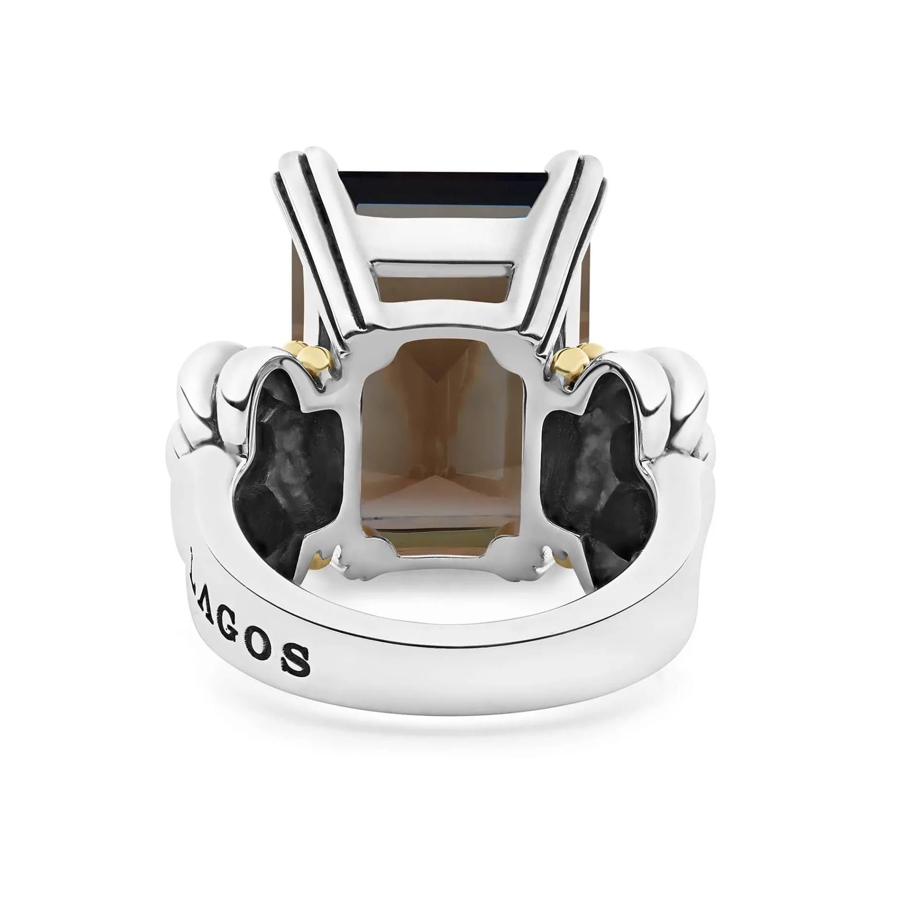 The Return Of A Lagos Icon. Our Signature Emerald-Cut Smokey Quartz Gemstone Ring With A Prong Setting In Sterling Silver And 18K Gold Caviar Beading.