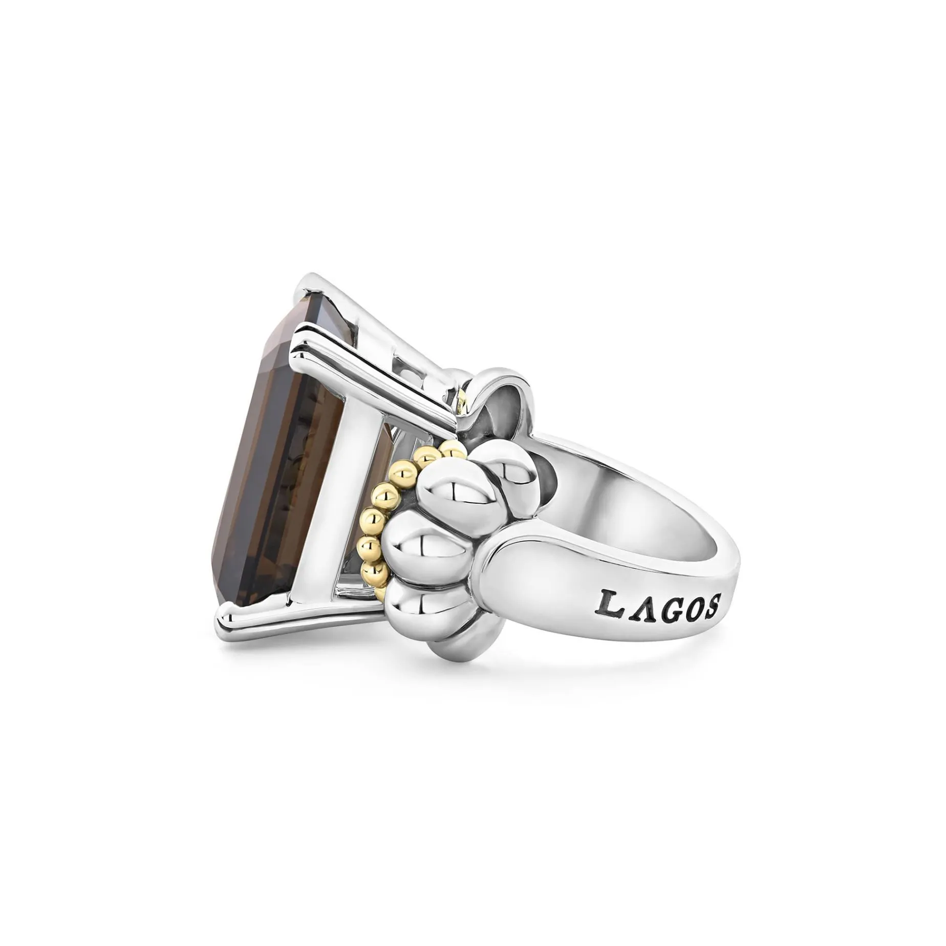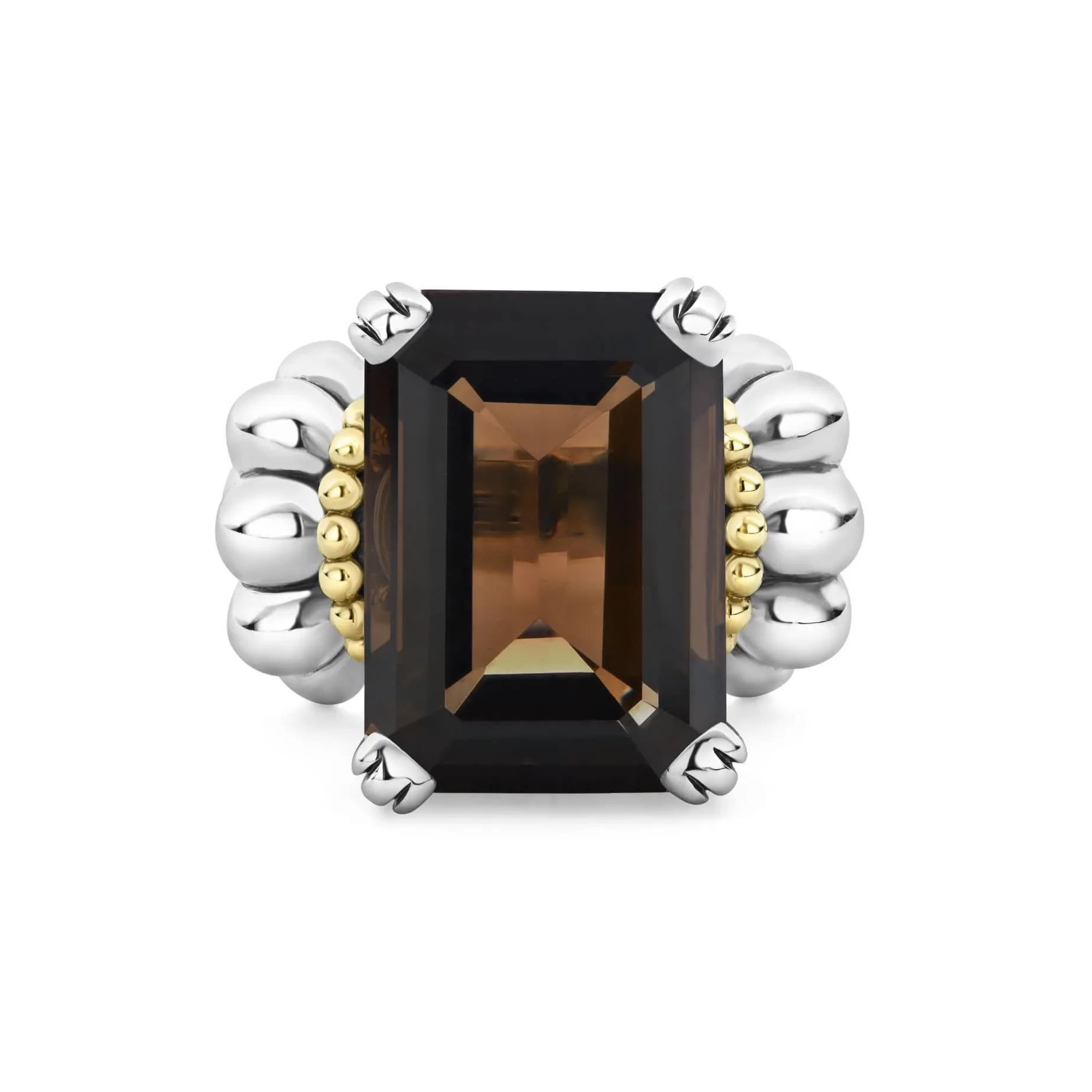 The Return Of A Lagos Icon. Our Signature Emerald-Cut Smokey Quartz Ring With A Prong Setting In Sterling Silver And 18K Gold Caviar Beading.