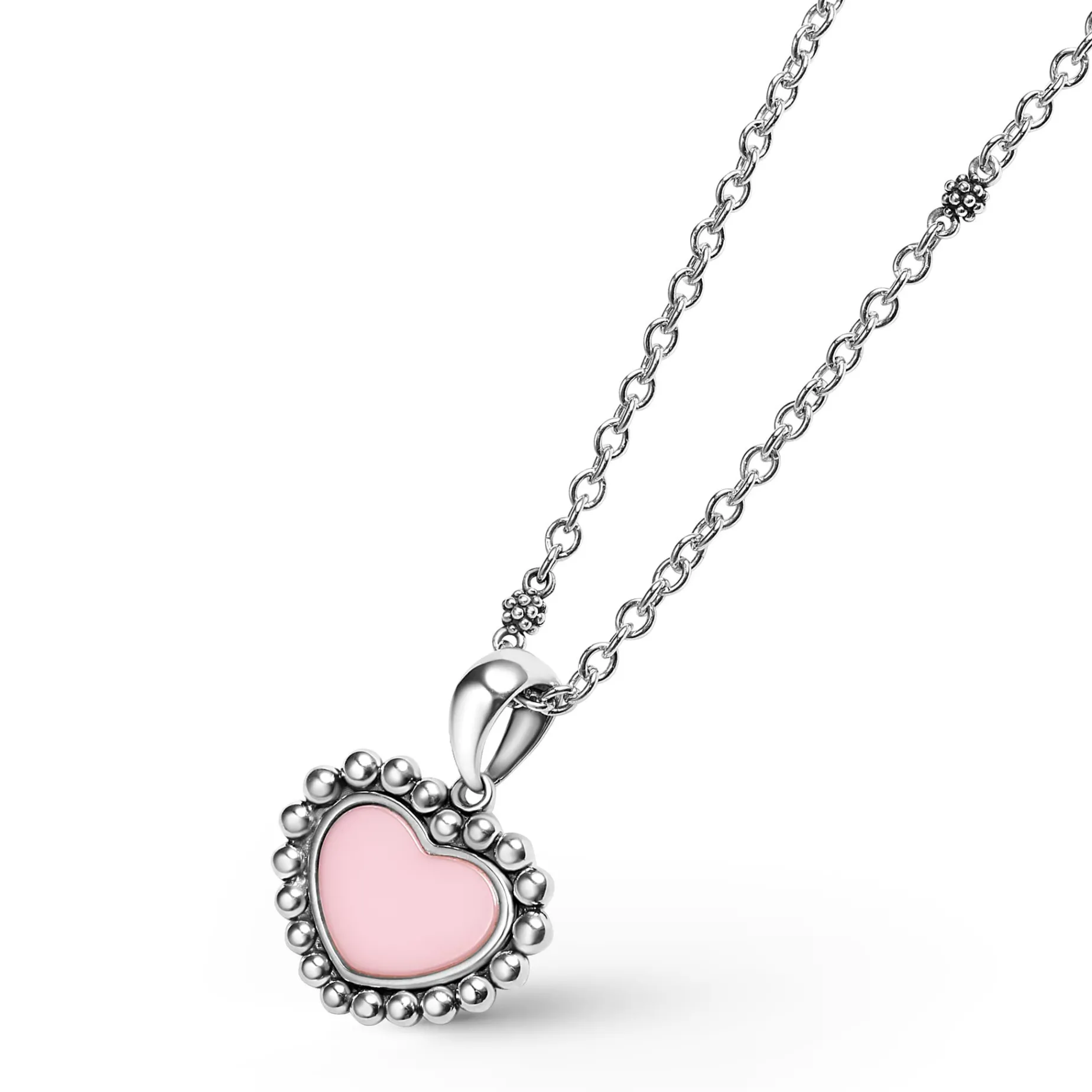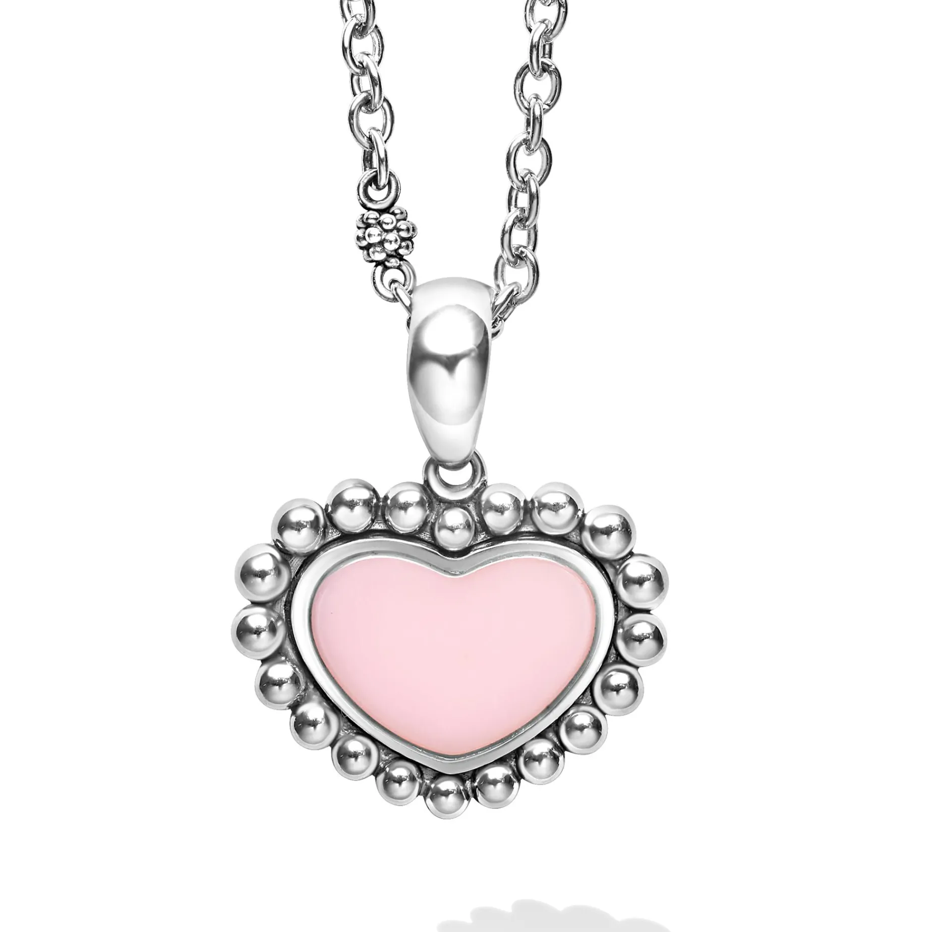 A Lagos Exclusive. Pink Ceramic Surrounded By Sterling Silver Caviar Beading Forms This Heart Pendant Necklace.