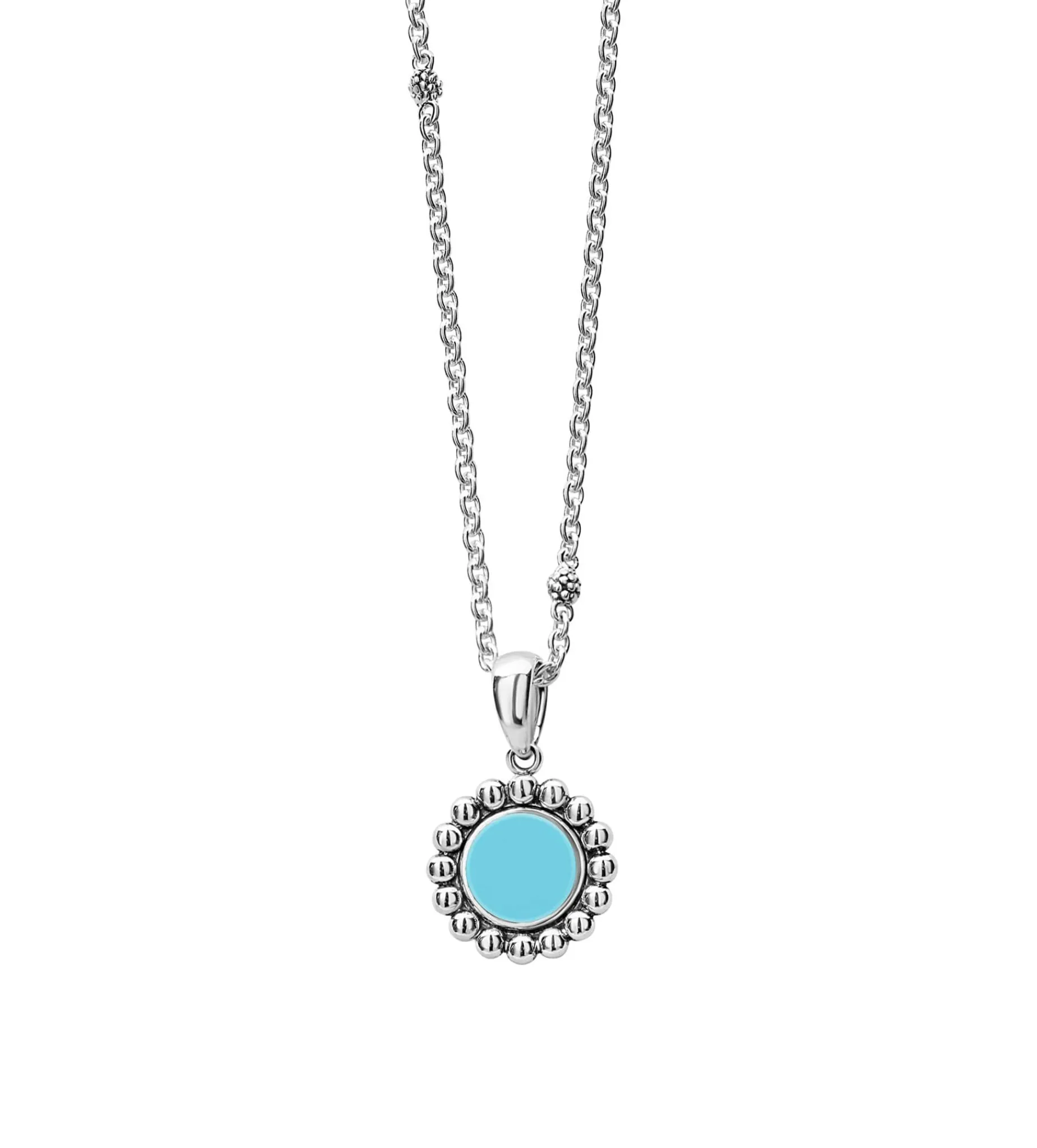 Blue Ceramic Pendant Framed By Sterling Silver Caviar Beading Finished On A Versatile Link Necklace With Six Sterling Silver Caviar Beaded Stations.