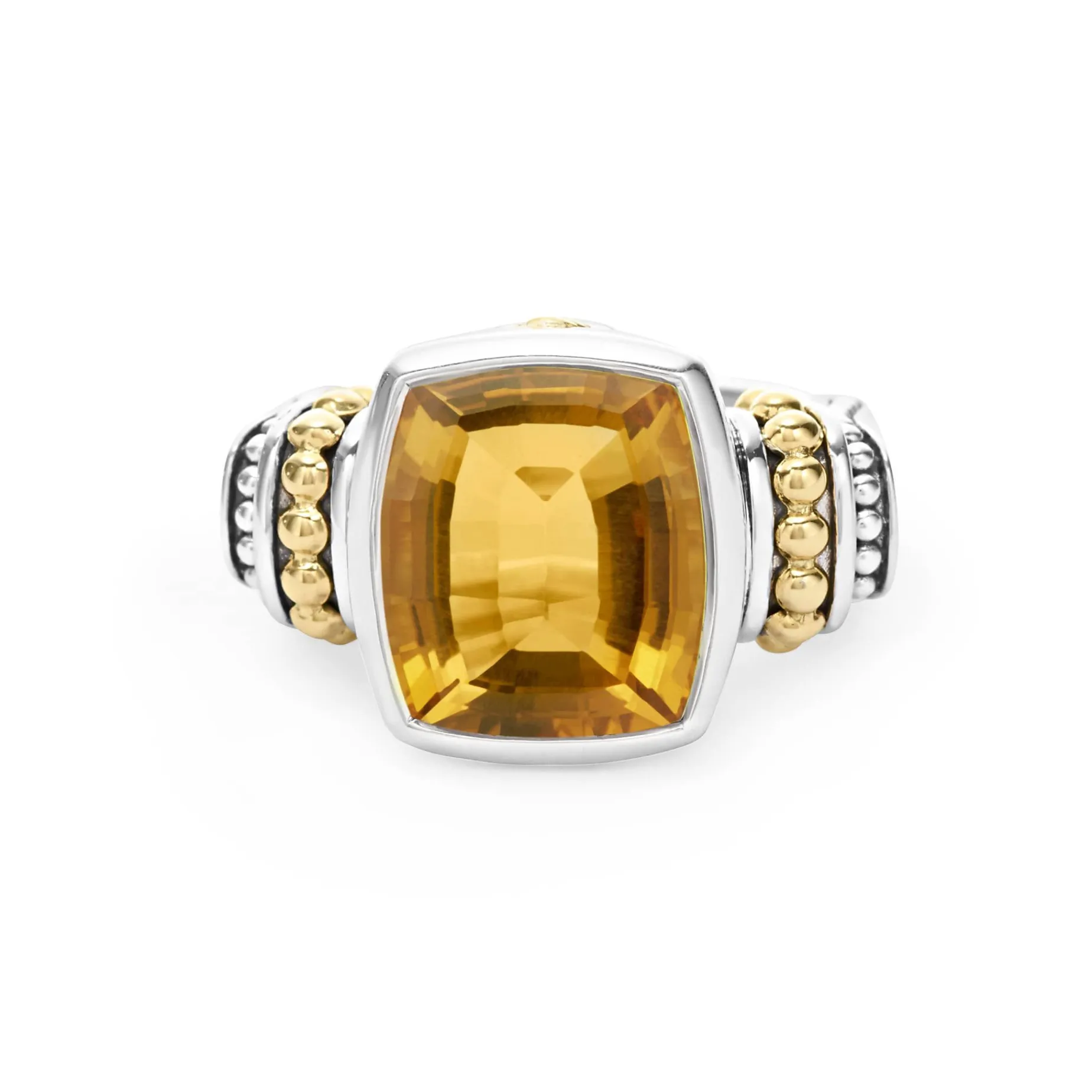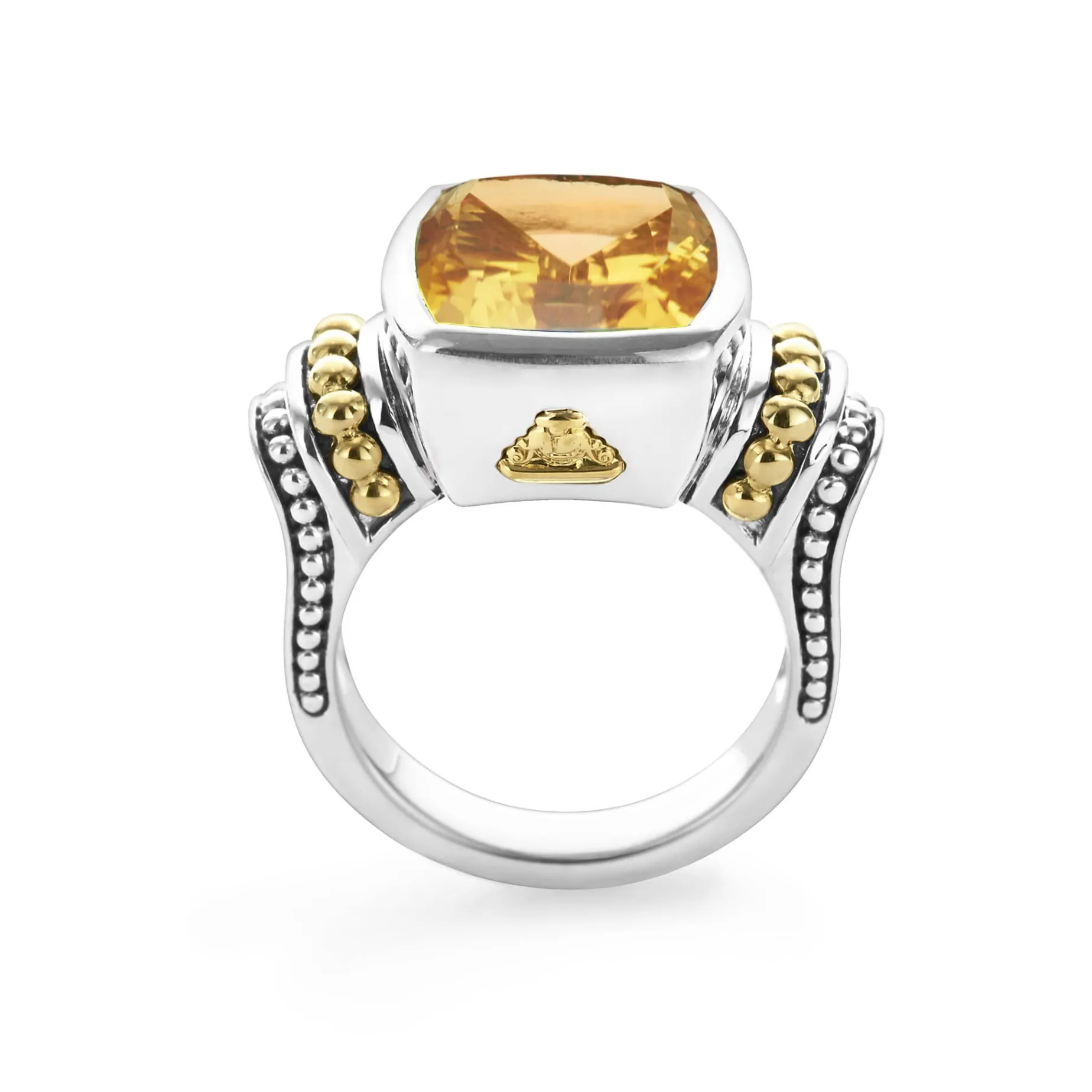 Citrine Bezel-Set Gemstone Ring With 18K Gold Caviar Beading On A Sterling Silver Band.