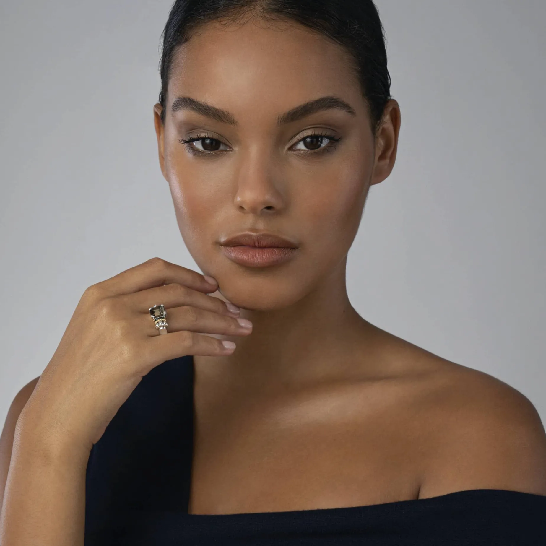 The Return Of A Lagos Icon. Our Signature Emerald-Cut Smokey Quartz Gemstone Ring With A Prong Setting In Sterling Silver And 18K Gold Caviar Beading.