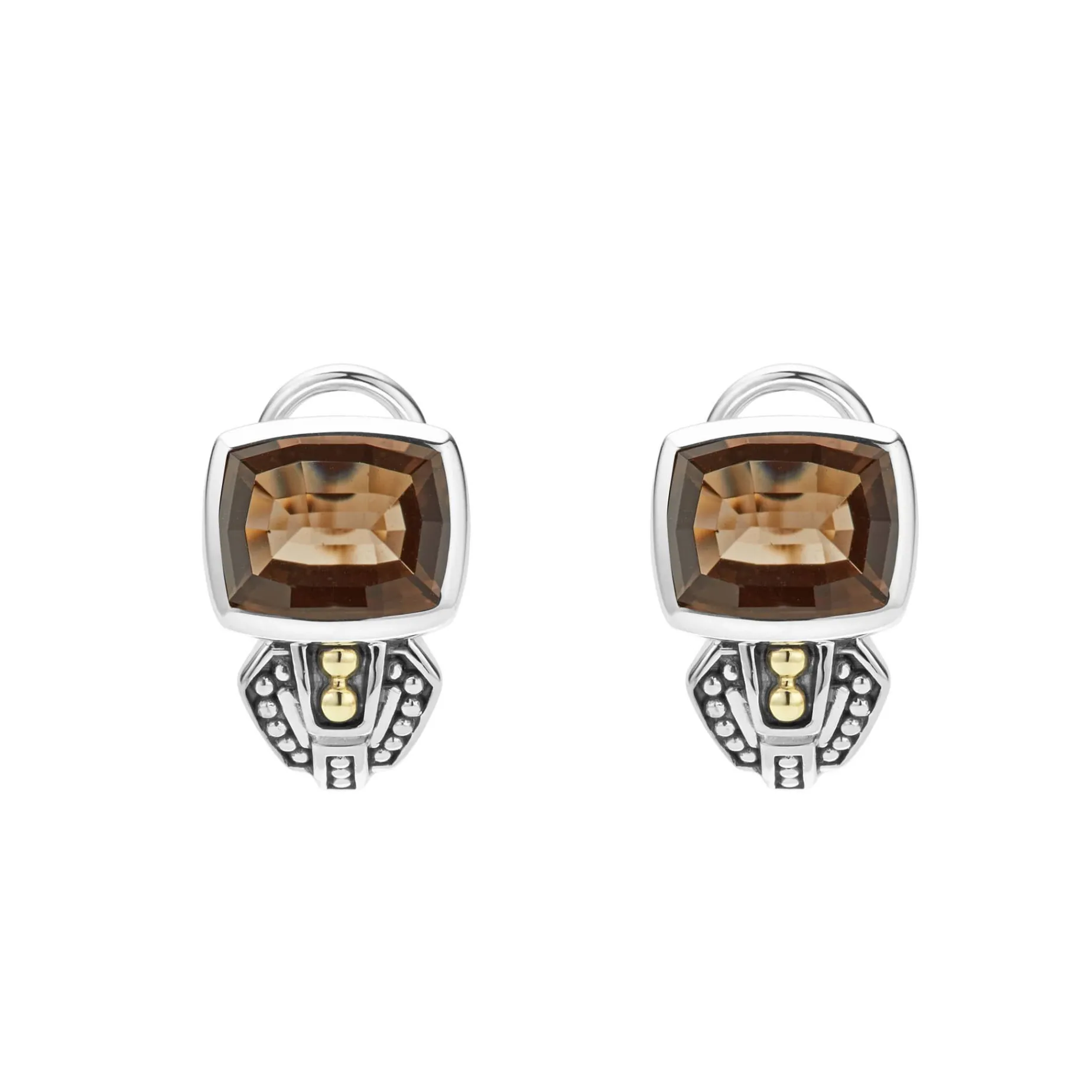 Smokey Quartz Bezel-Set Gemstone Earrings With 18K Gold And Sterling Silver Caviar Beaded Accents.