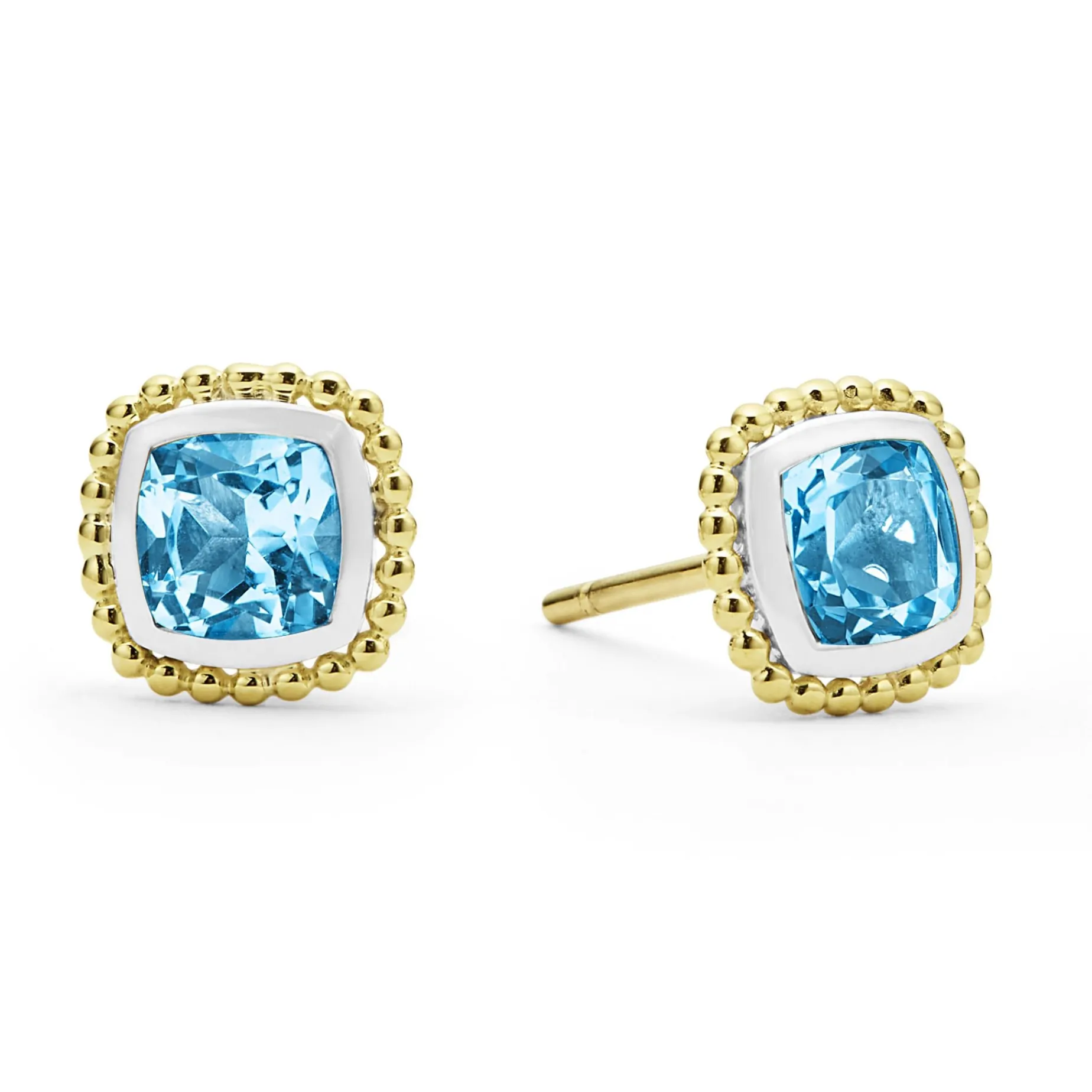 - One Set Of Swiss Blue Topaz Gemstone Stud Earrings Surrounded By Smooth Sterling Silver And 18K Gold Caviar Beading.