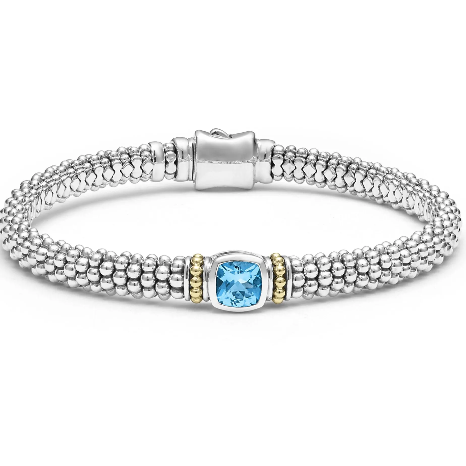 - One Swiss Blue Topaz Gemstone And Sterling Silver Caviar Beaded Bracelet Accented With 18K Gold Detailing. Set Includes Size Medium.