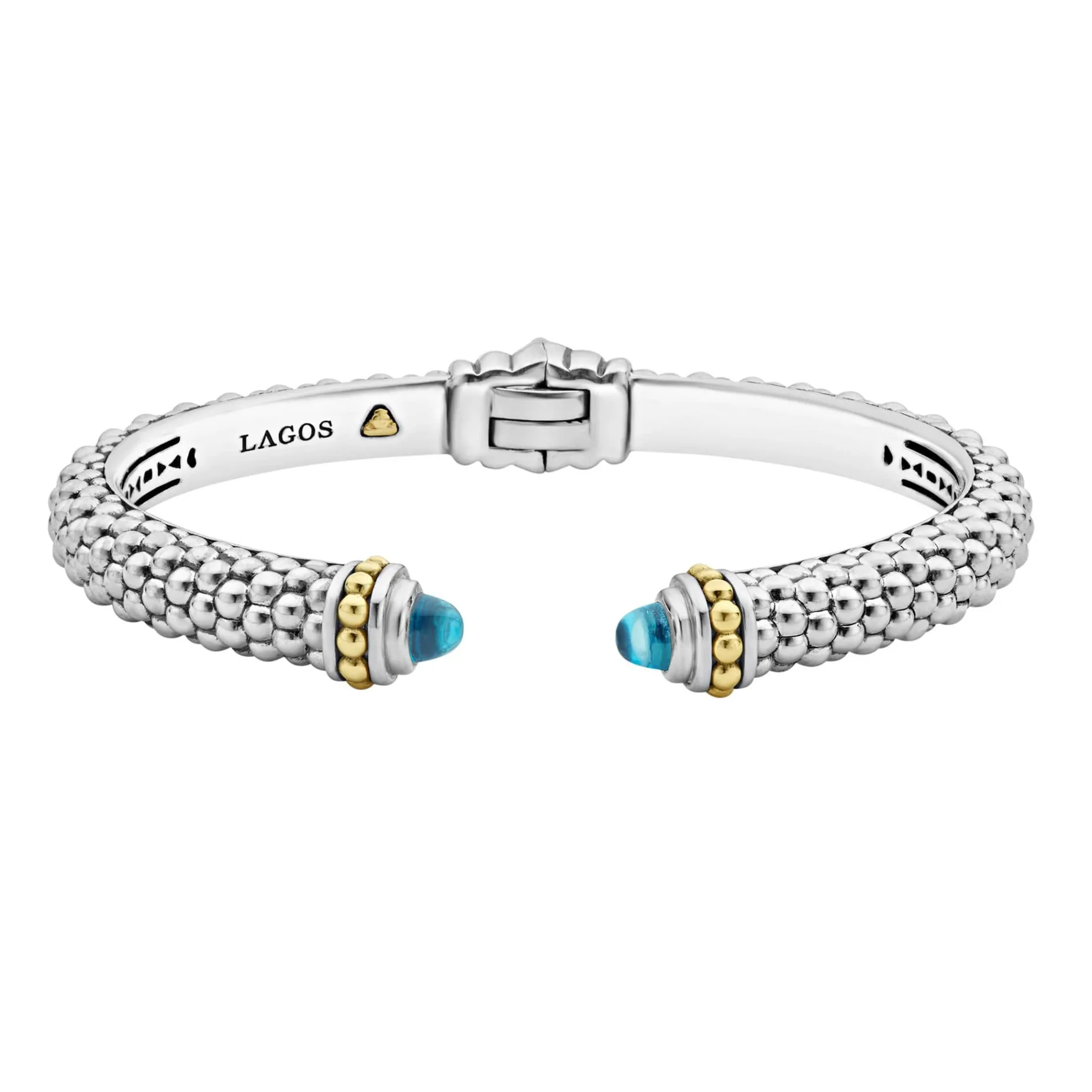 Caviar Beading And Highly Polished Sterling Silver Stations Comprise This Innovative Cuff Bracelet Detailing Swiss Blue Topaz Gemstone End Caps.