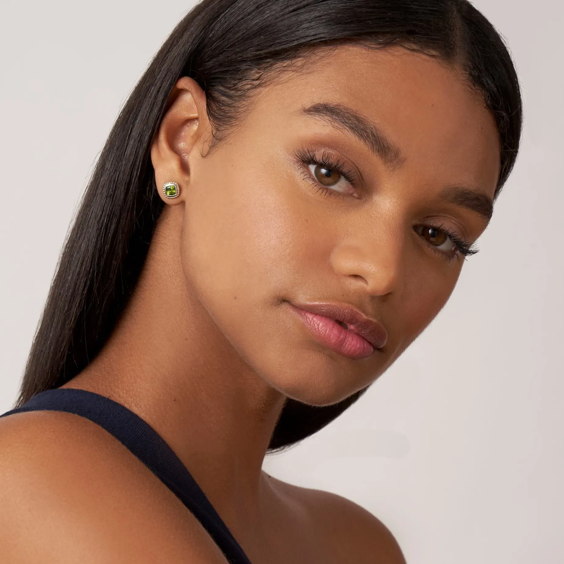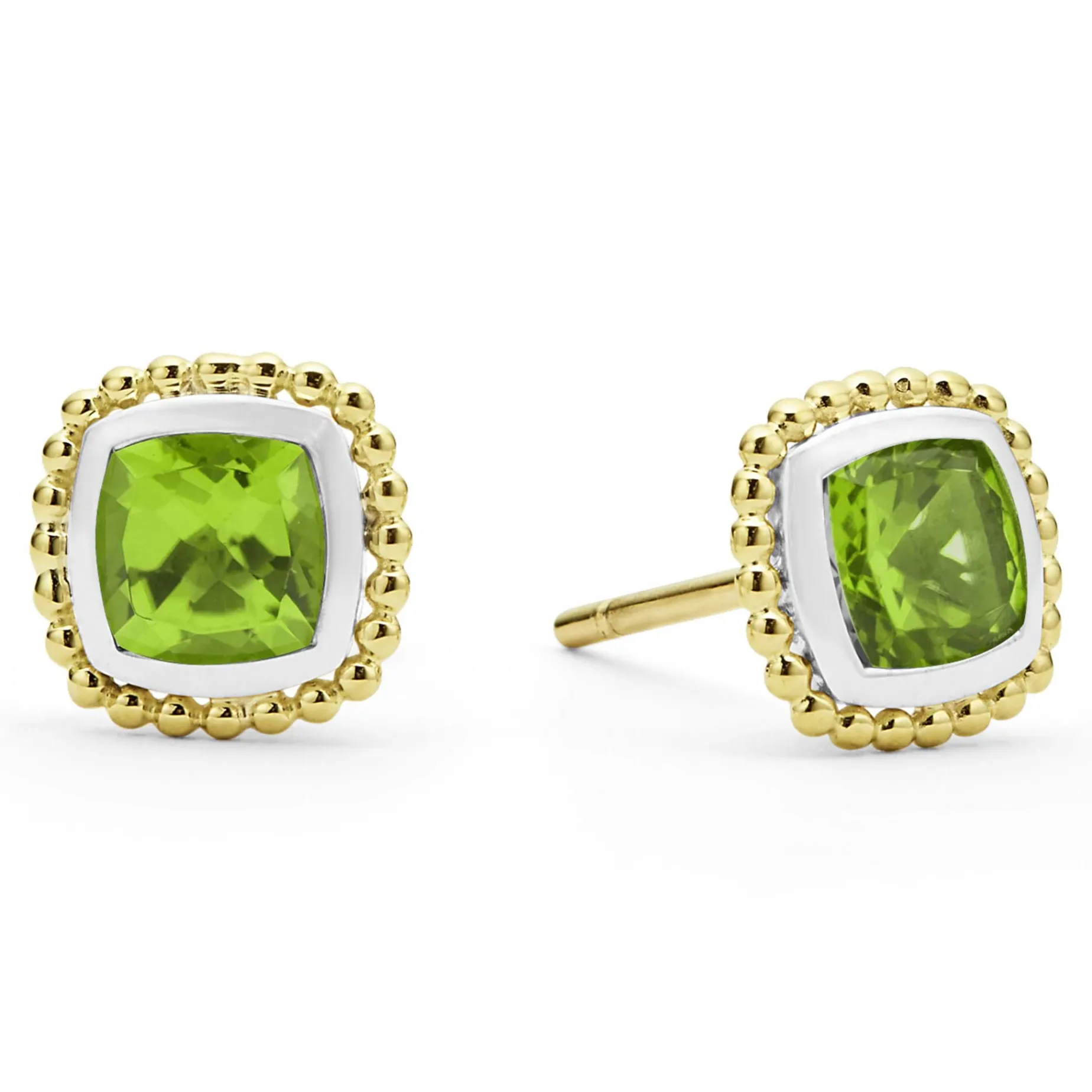 Peridot Gemstone Stud Earrings Surrounded By Smooth Sterling Silver And 18K Gold Caviar Beading.