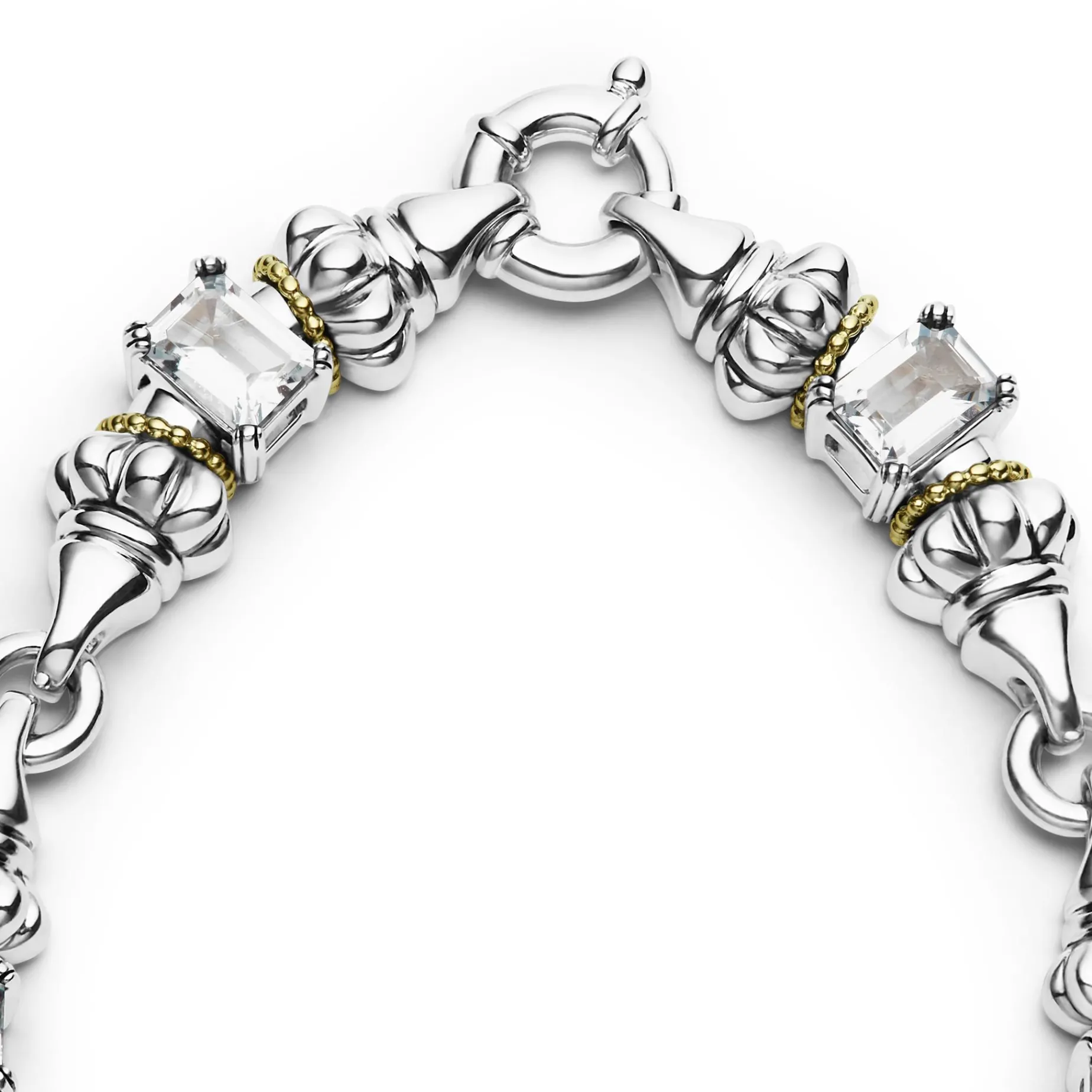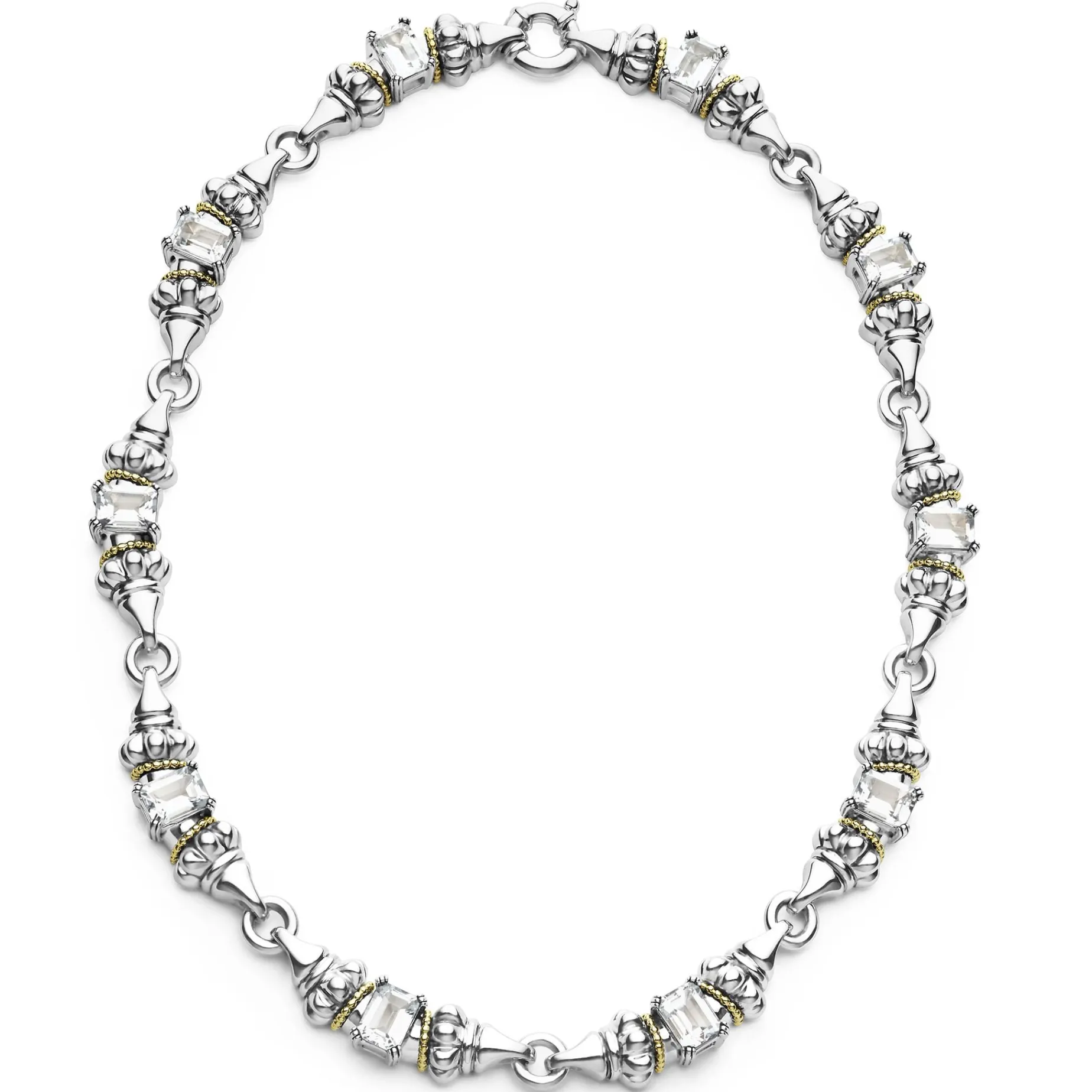 Ten Emerald-Cut White Topaz Gemstones With A Prong Setting In Sterling Silver And 18K Gold Caviar Beading Form This Necklace.