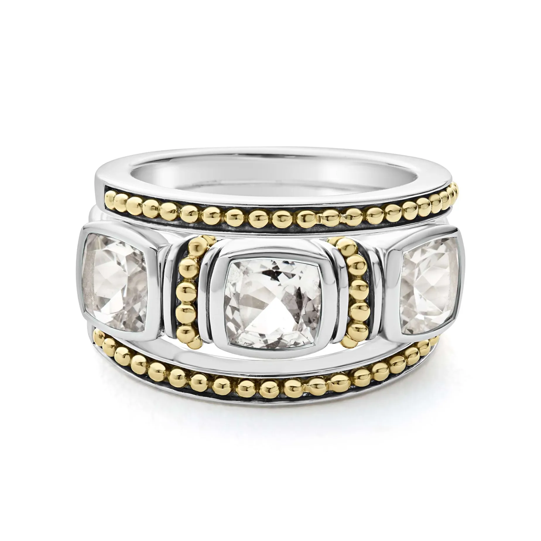 A Trio Of Stacking Rings With One White Topaz Ring And Two 18K Gold Caviar Beaded Rings With Sterling Silver Accents.