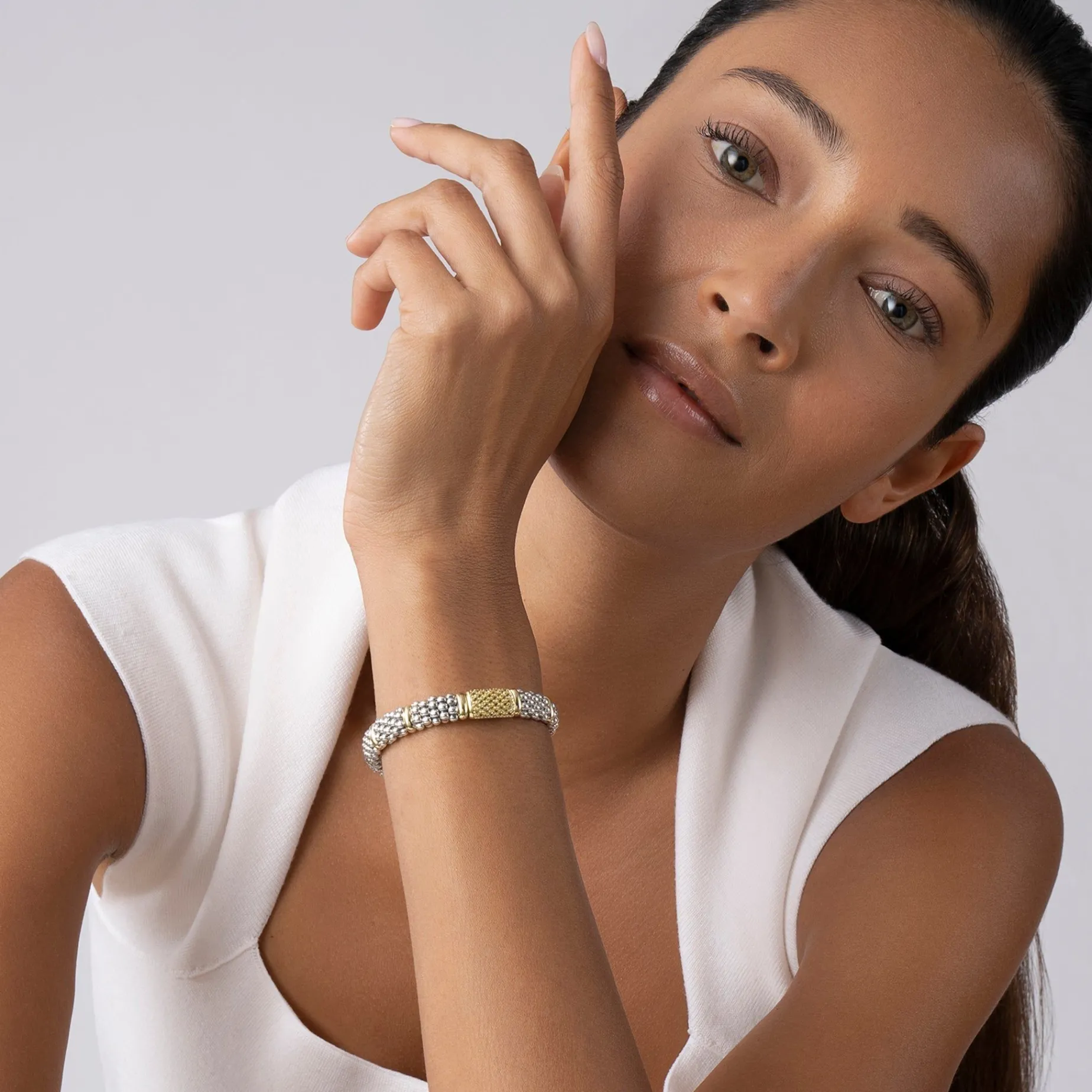 A Lagos Exclusive. Ten 18K Gold Stations Highlight This Sterling Silver Caviar Beaded Bracelet With A Pavé Station Of Yellow Sapphire Gemstones.