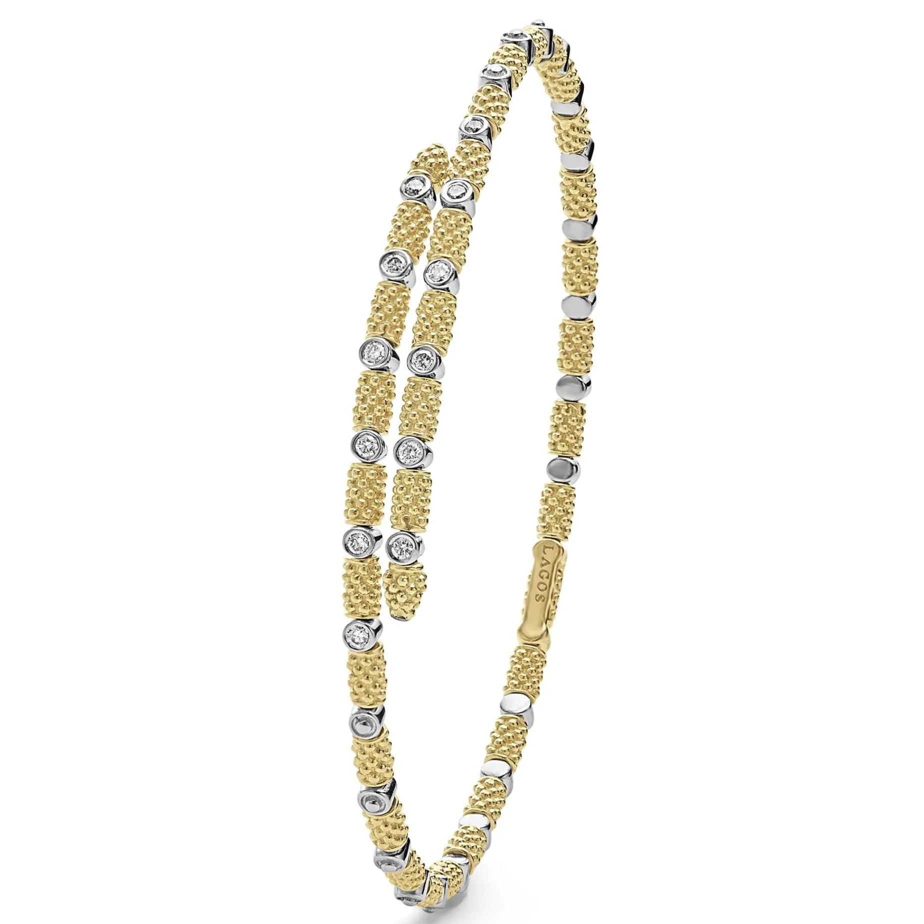 Diamonds Surrounded By 18K Gold Superfine Caviar Beading Form This Cuff Bracelet. Lagos Diamonds Are The Highest Quality Natural Stones.