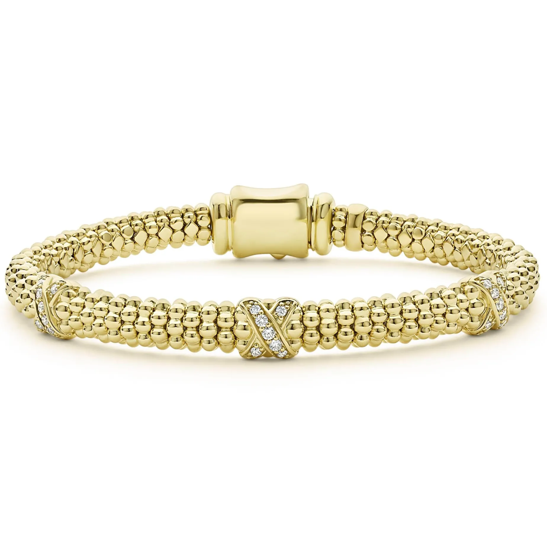 Three Pavé Diamond X Stations Accent This 18K Gold Caviar Beaded Bracelet. Lagos Diamonds Are The Highest Quality Natural Stones.