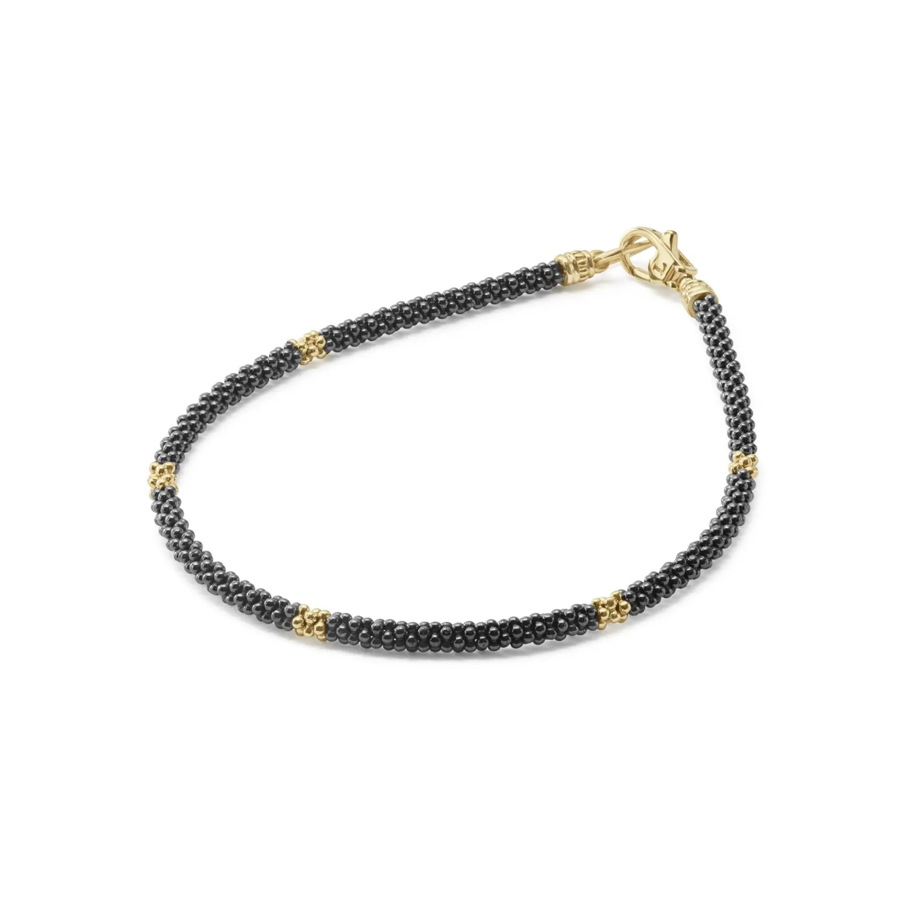 Five 18K Gold Stations Highlighted By Black Ceramic Caviar Beading Form This Signature Bracelet.