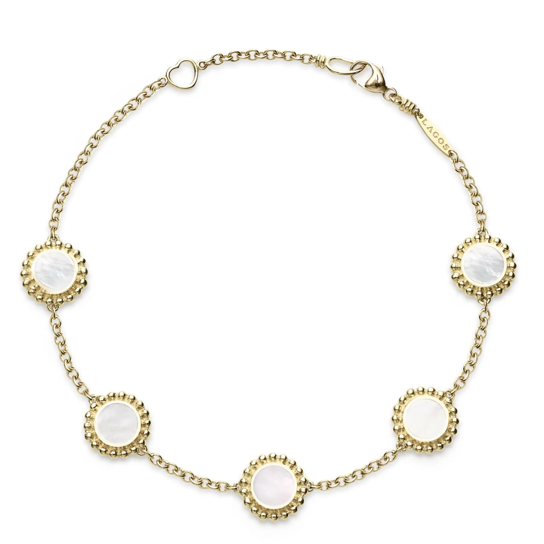 An 18K Gold Bracelet Including Five Mother Of Pearl Inlay Stations With Caviar Beaded Details.