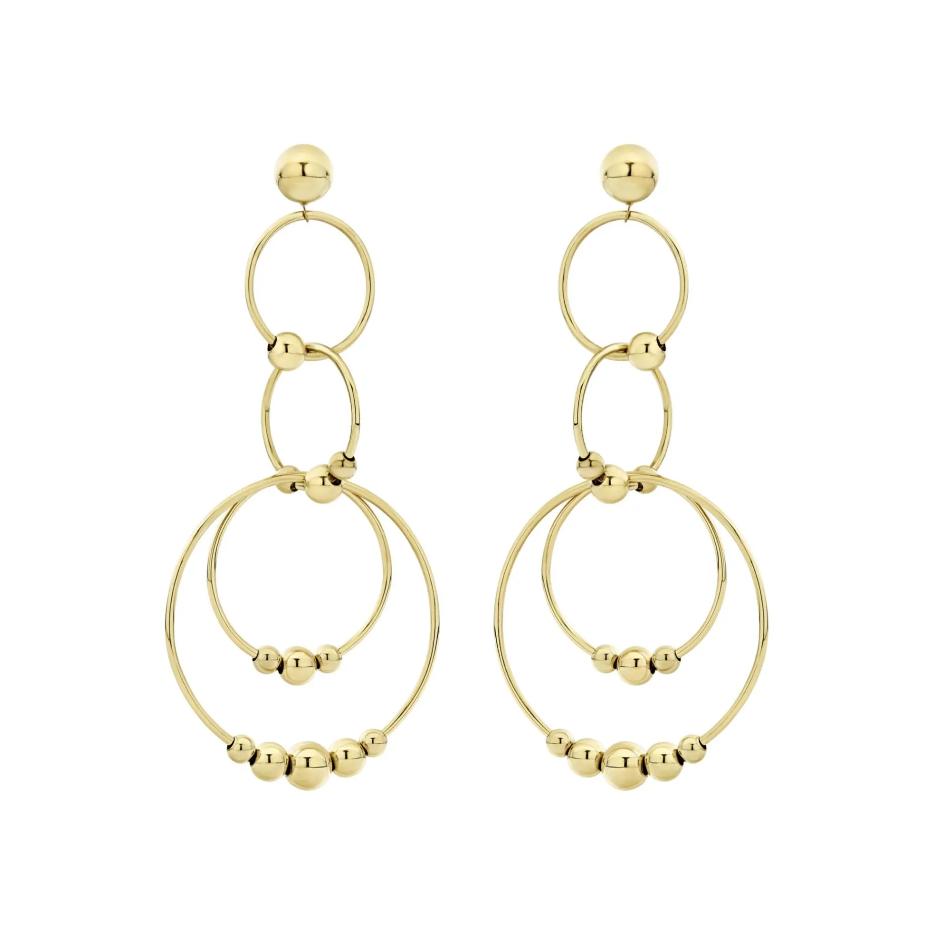 Long 18K Gold Drop Earrings With Four Circles And Caviar Beaded Ball Details.