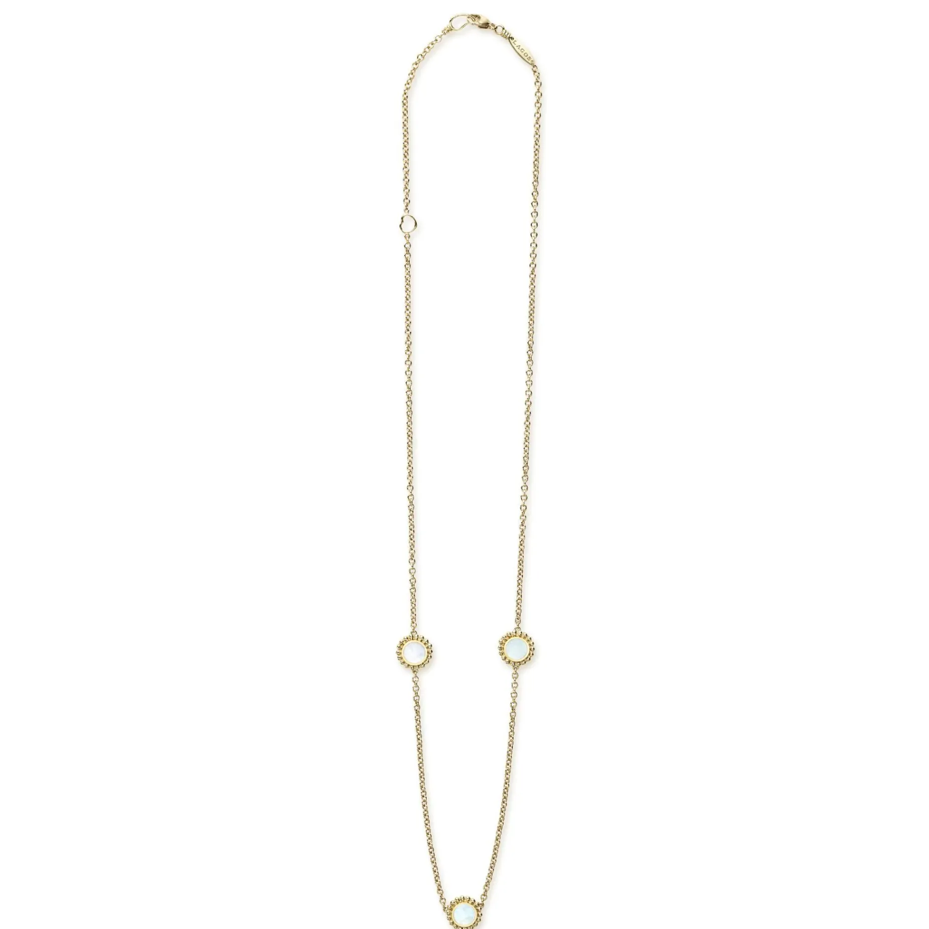 Three Round Mother Of Pearl Stations Set And Surrounded By 18K Gold Caviar Beading On This Necklace.