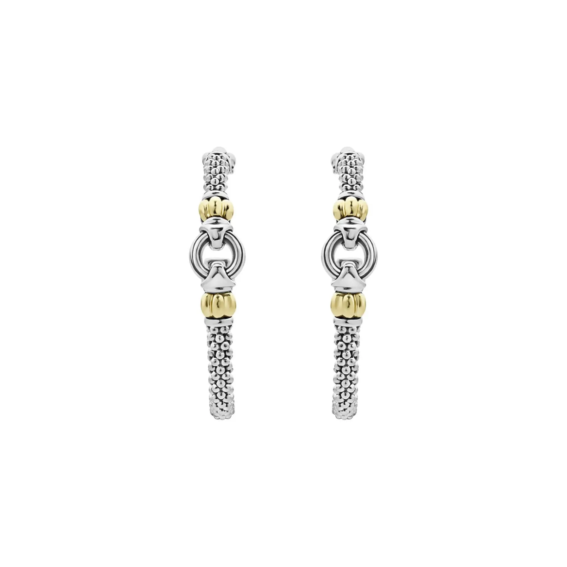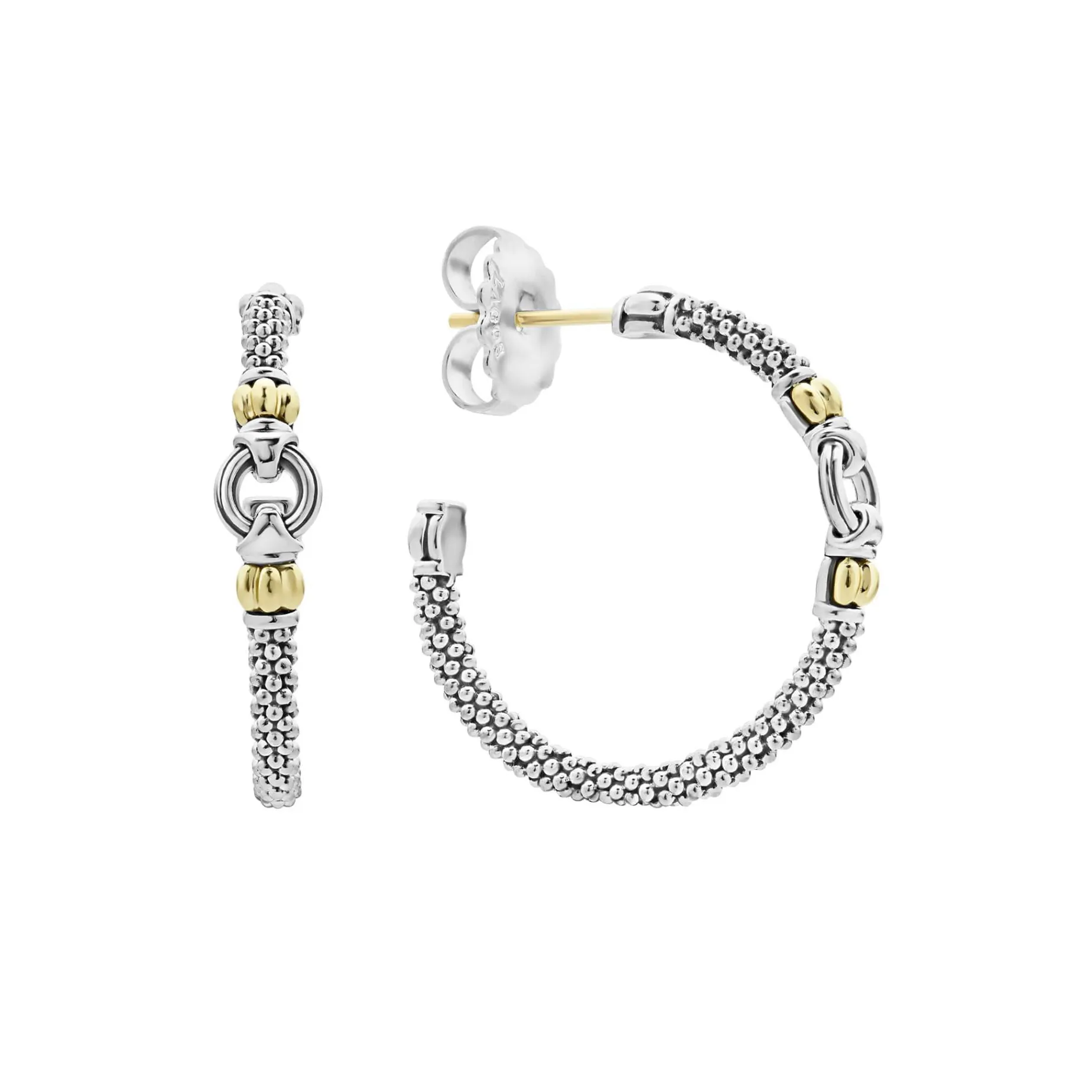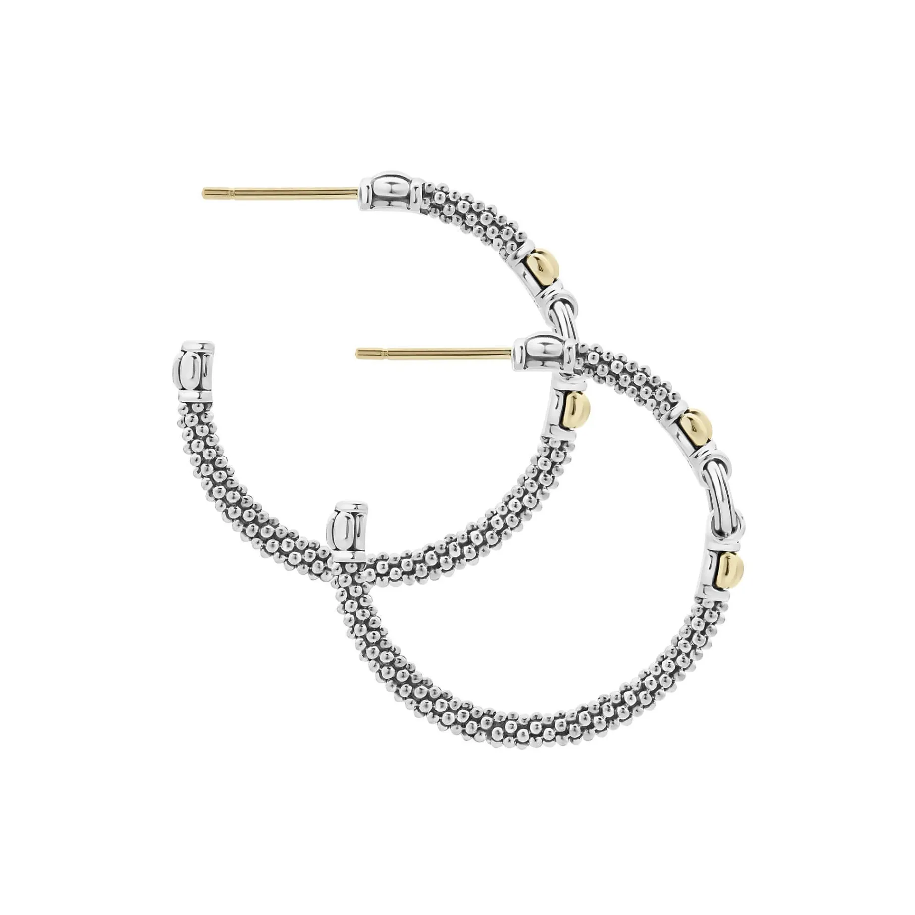 Sterling Silver Caviar Hoop Earrings With A Circle Motif And 18K Gold Accents.