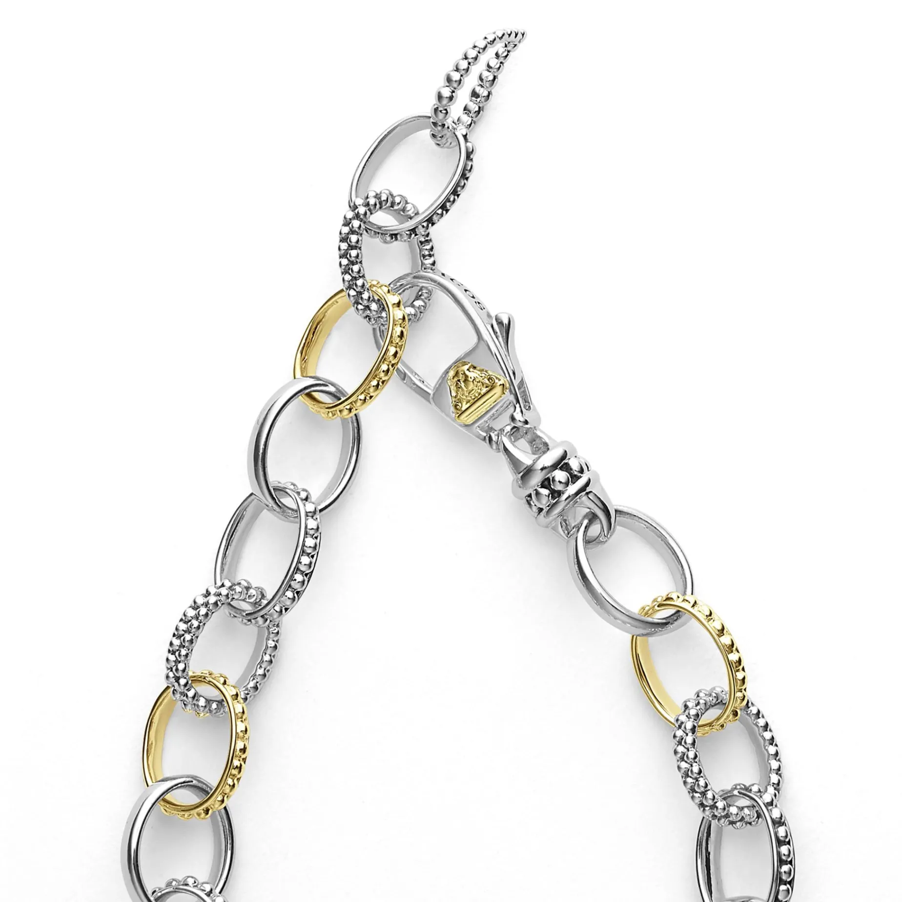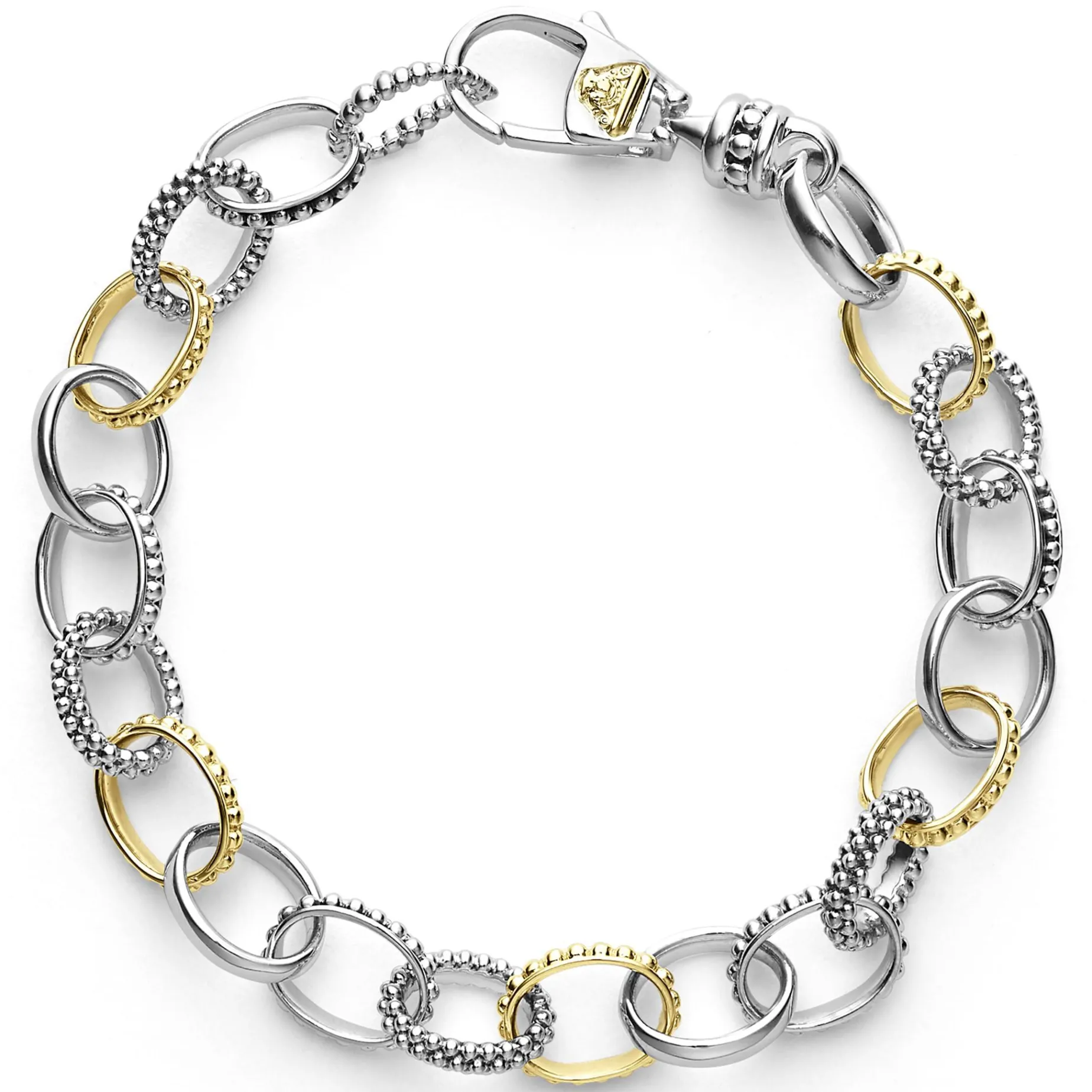 A Two Tone, Sterling Silver And 18K Gold, Link Bracelet With Alternating Caviar Beading And Smooth Links.
