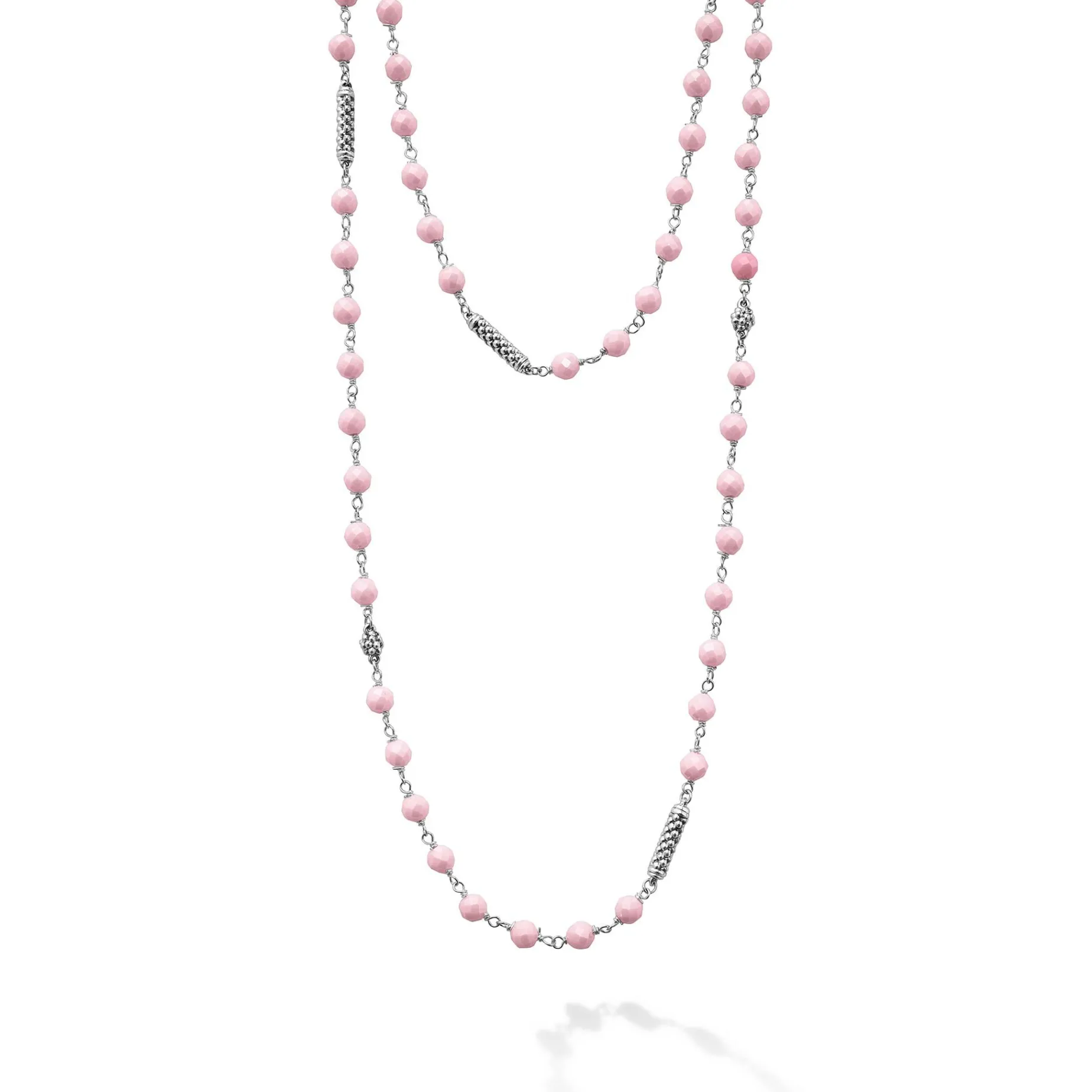 Pink Ceramic And Sterling Silver Caviar Beaded Necklace Finished On A Toggle Clasp.