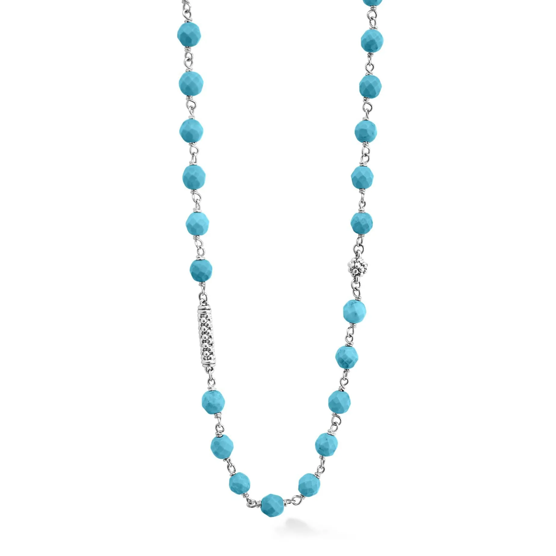 Turquoise And Sterling Silver Caviar Beaded Necklace Finished With Signature Lobster Clasp.