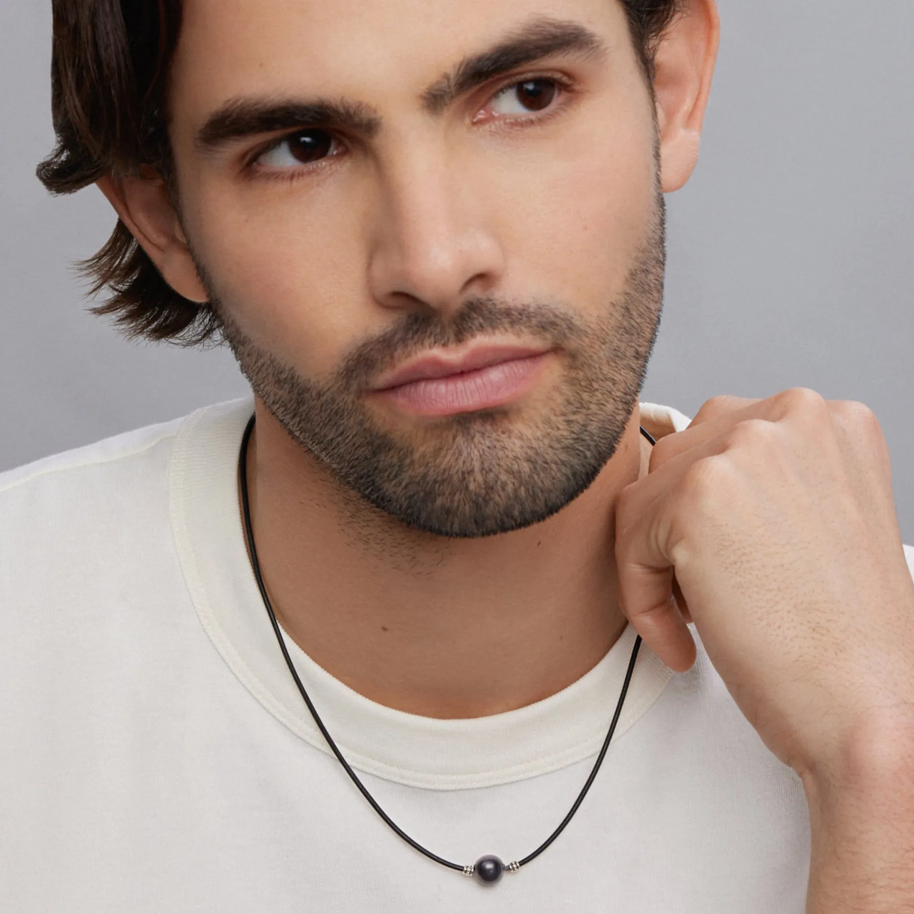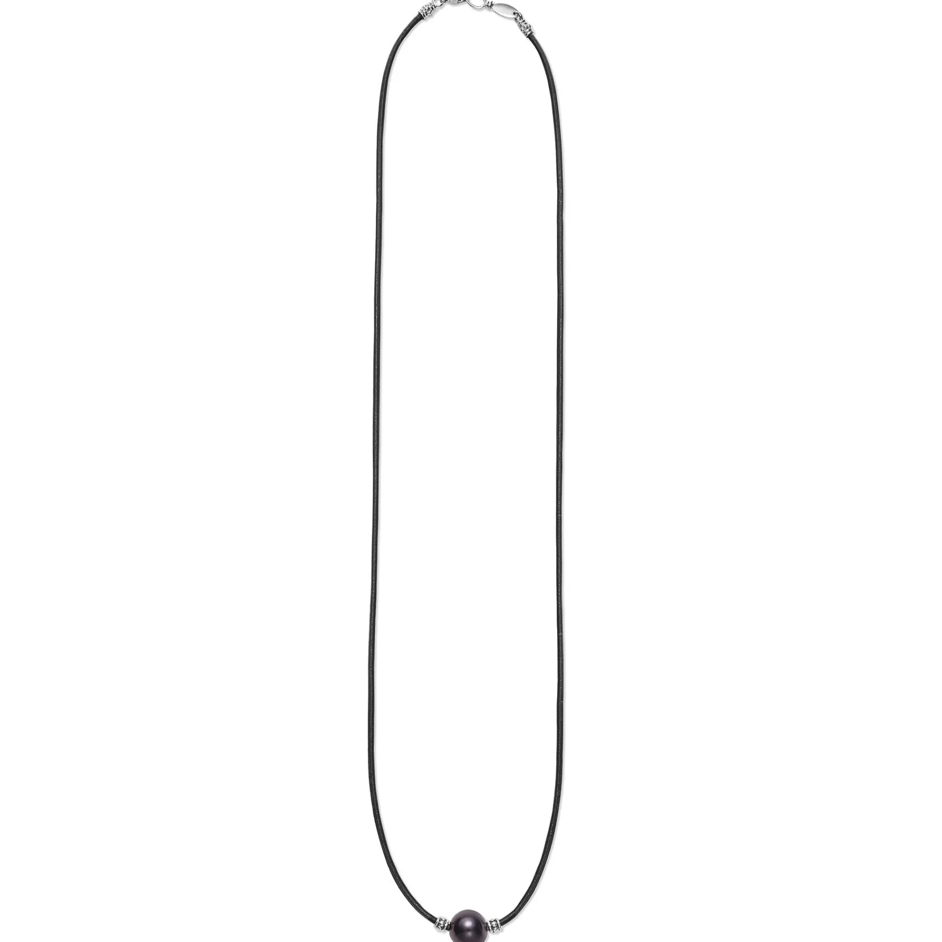 A Single Tahitian Black Pearl Station Accented By Sterling Silver Finished On A 20 Inch Cord Necklace.