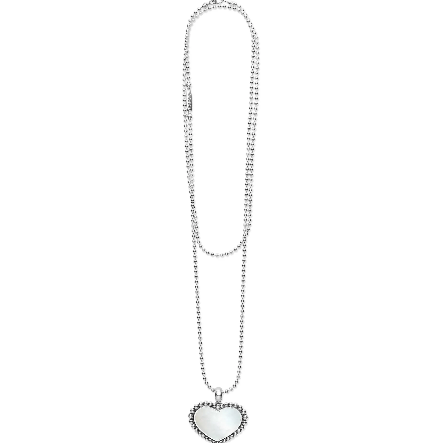 A White Mother Of Pearl Gemstone Pendant Framed By Sterling Silver Caviar Beading In The Shape Of A Heart Finished On A Ball Chain Necklace.