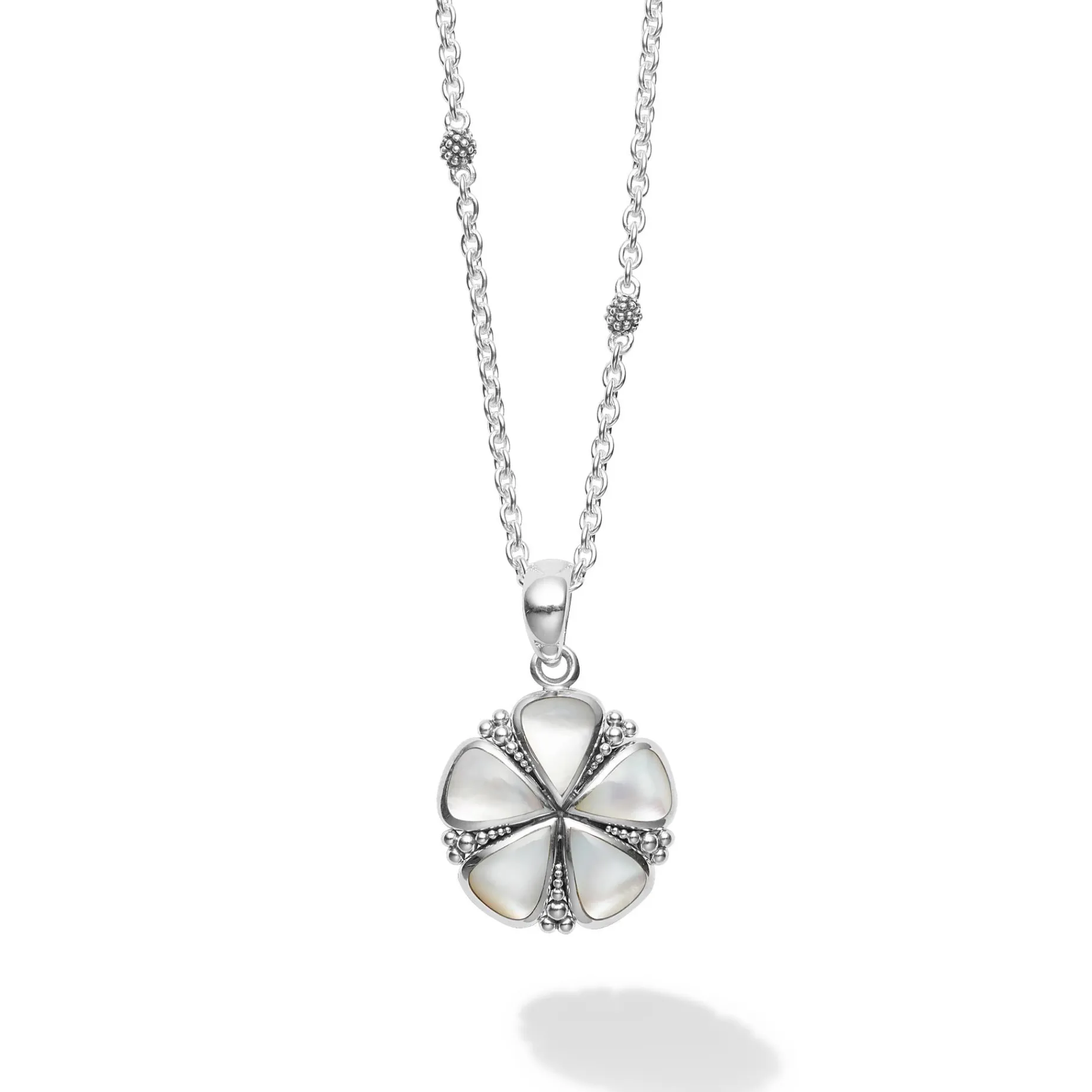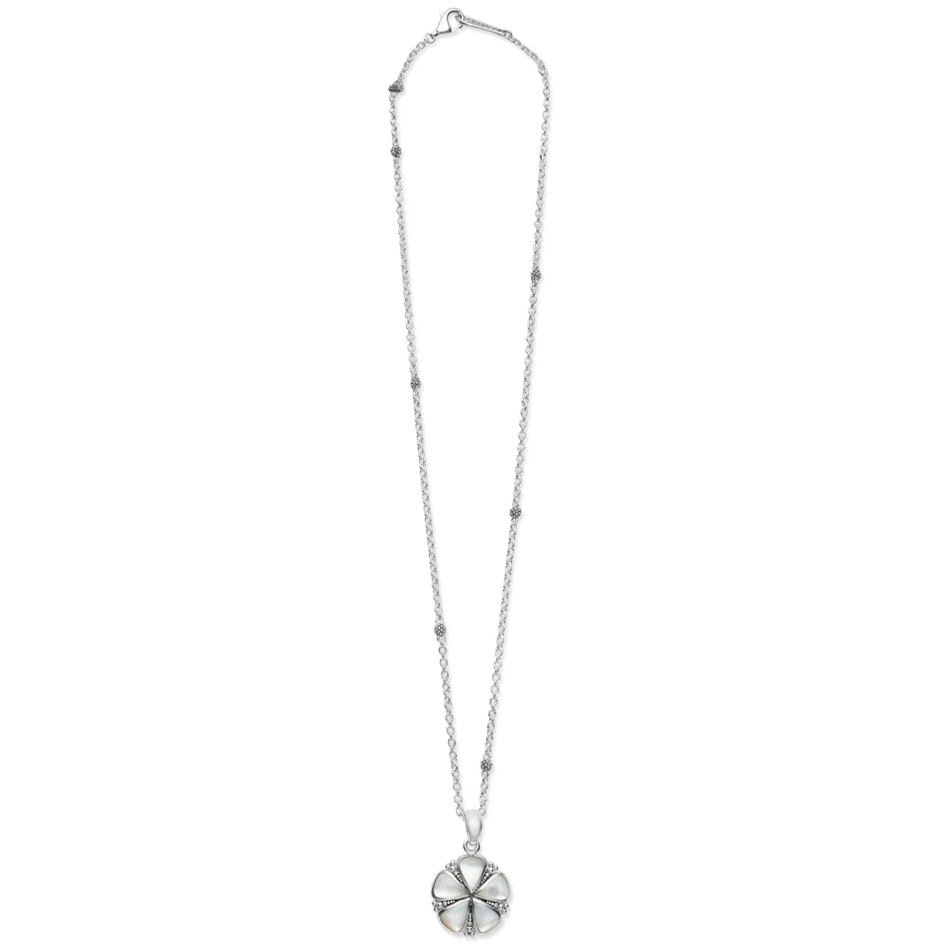 A Lagos Exclusive. Our Unique White Mother Of Pearl Flower Pendant Finished On A Versatile Link Necklace With Six Sterling Silver Caviar Beaded Stations.