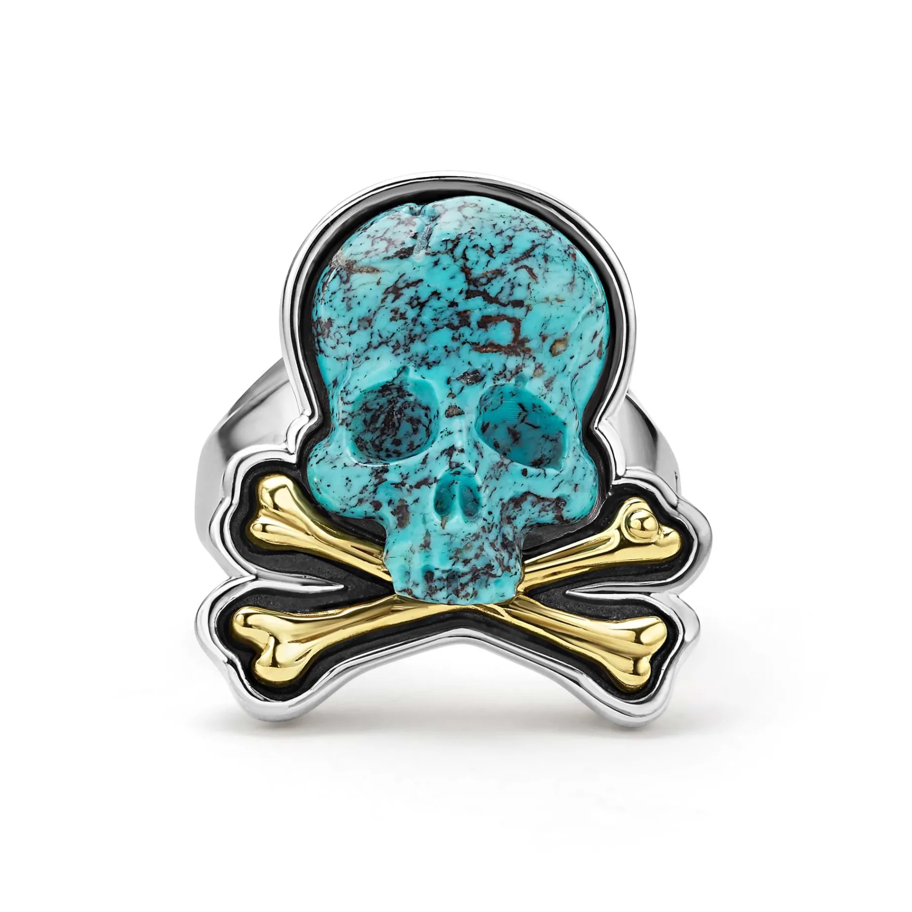 Intricately Crafted Turquoise Gemstone And 18K Gold Skull And Bones Motif Ring Surrounded By Sterling Silver.